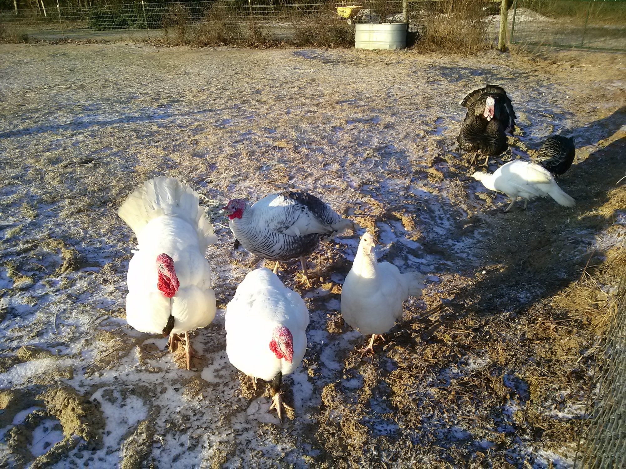 The turkeys experienced their first snow yesterday! After realizing that eating it wasn't productive, they ignored it altogether. The hens spent most of the day on our porch, they didn't particularly enjoy it on their feet. The five toms strutted all day long, and apparently the beautiful sight of them strutting in the snow was enough to woo the gray/brown hen, as she squatted and allowed one of the royal palm colored toms to breed her.