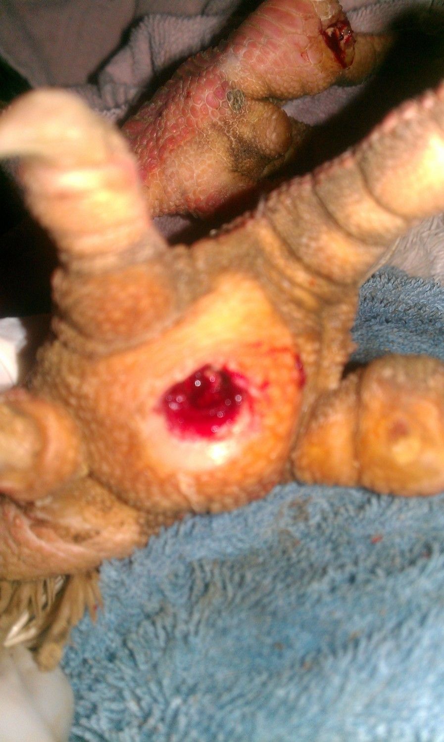 After trying to clean all of the crap out, this is what the bottom of the foot looked like. Unfortunately, I could tell that there was still crap in there but I could not get to it. So, I turned his foot over and I found yet another bumble foot ON TOP of his foot, so I had to work on that area as well.