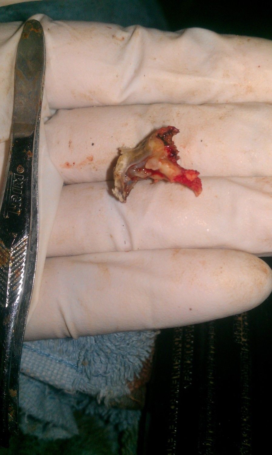 So, now I had to work on getting more crap out. So, this time, I played with the scab to see how easy it would be for me to get that plug. Well, I was able to pluck that plug out and I was sooooooooooooooooooo relieved. This is what the plug looks like. It is VERY important to make sure you get the plug out. If not, the bird will continue to have bumble foot as my Tom has. The plug that I pulled out is shaped just like a ear plug but kinda looks like a kernel of corn.