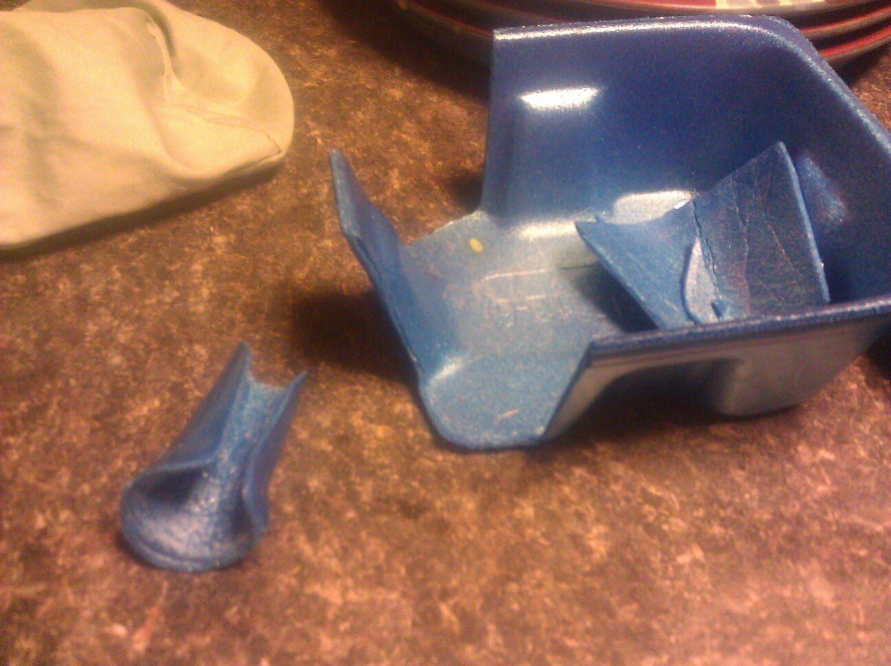 Next I cut the corner off of styrofoam mushroom box and crushed it in my fingers to make it bend without breaking. It's the perfect shape and length for her leg since it flairs out on one end. That makes it fit over her ankle and foot without confining them too much while still bracing her leg into a straight position.
