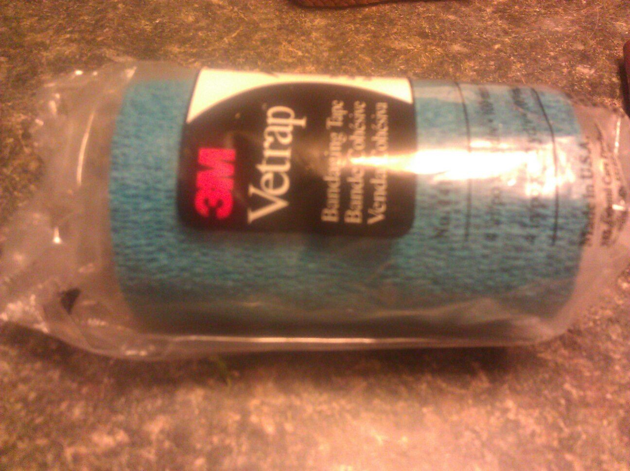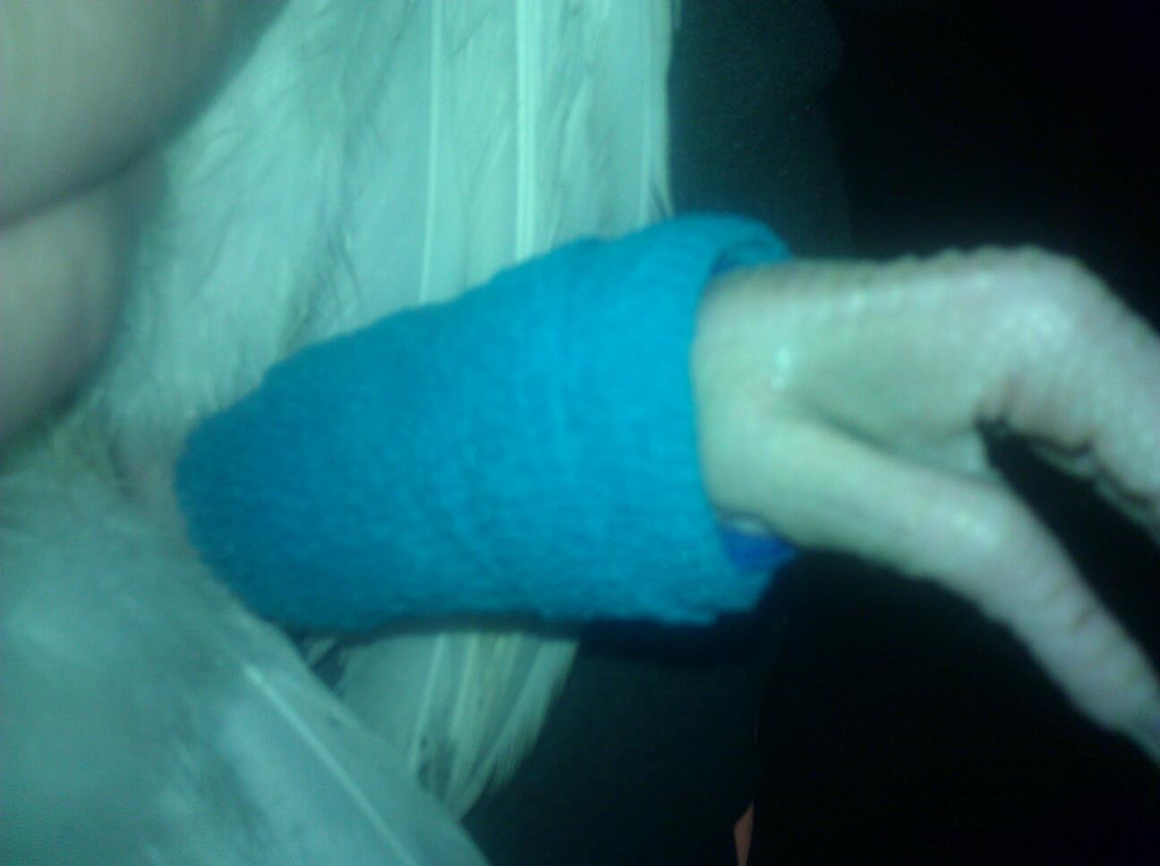 Then I wrapped it with stretchy vet wrap. We bought it in the horse section at TS. It comes in multiple colors. My daughter picked this bright blue which seems to work with the other turkeys and her. They don't peck at it. I wouldn't recommend red or anything with spots.