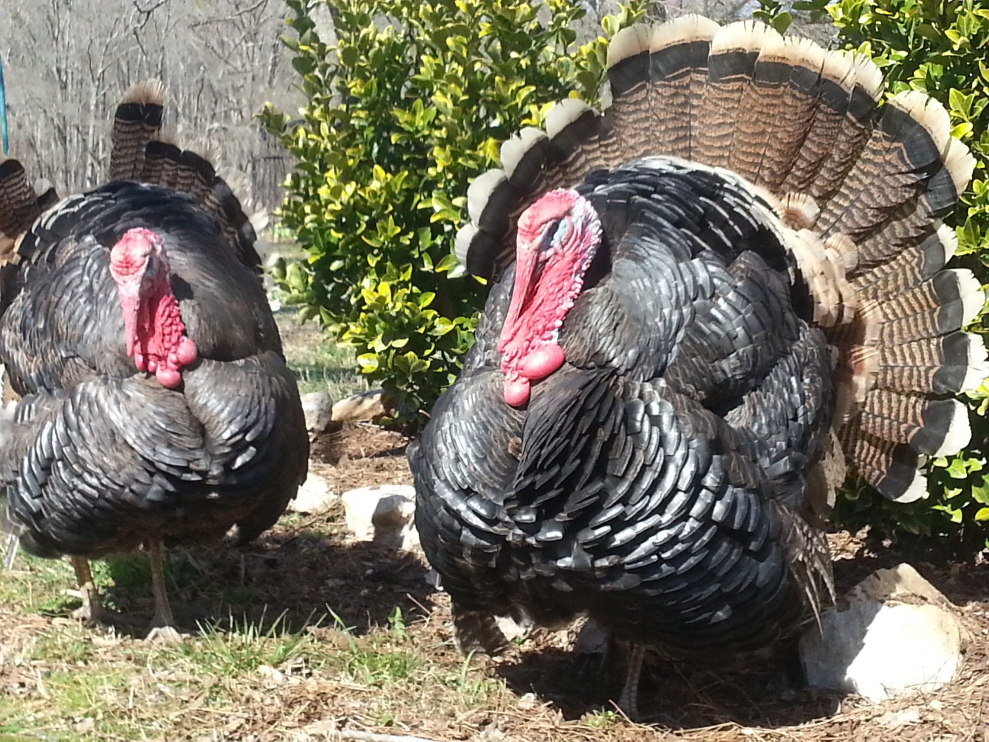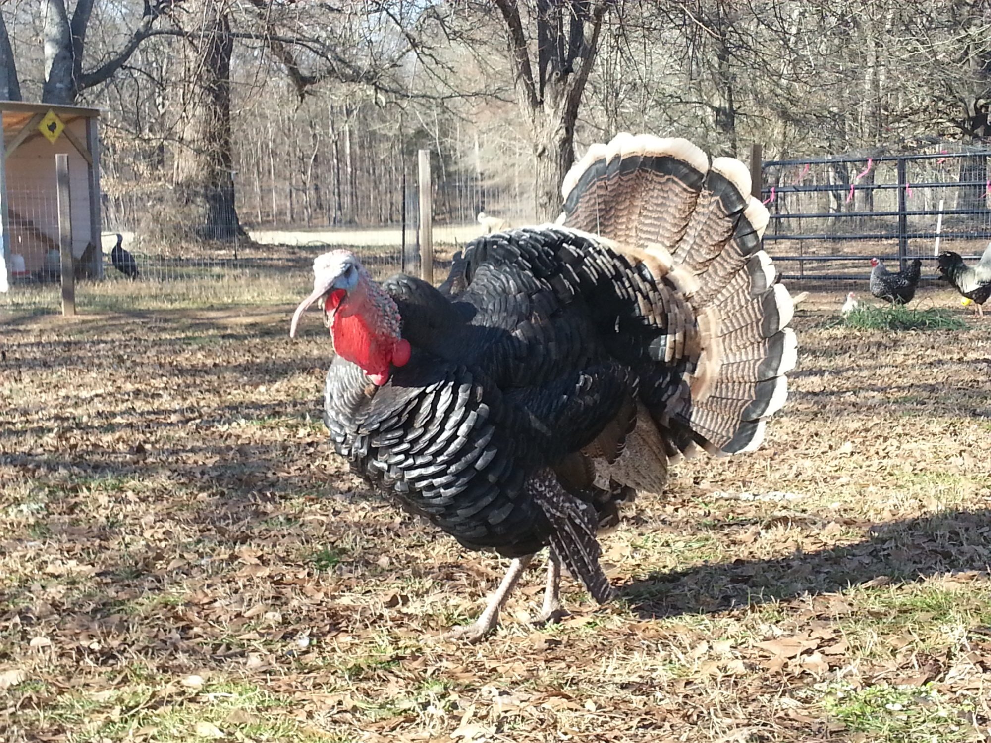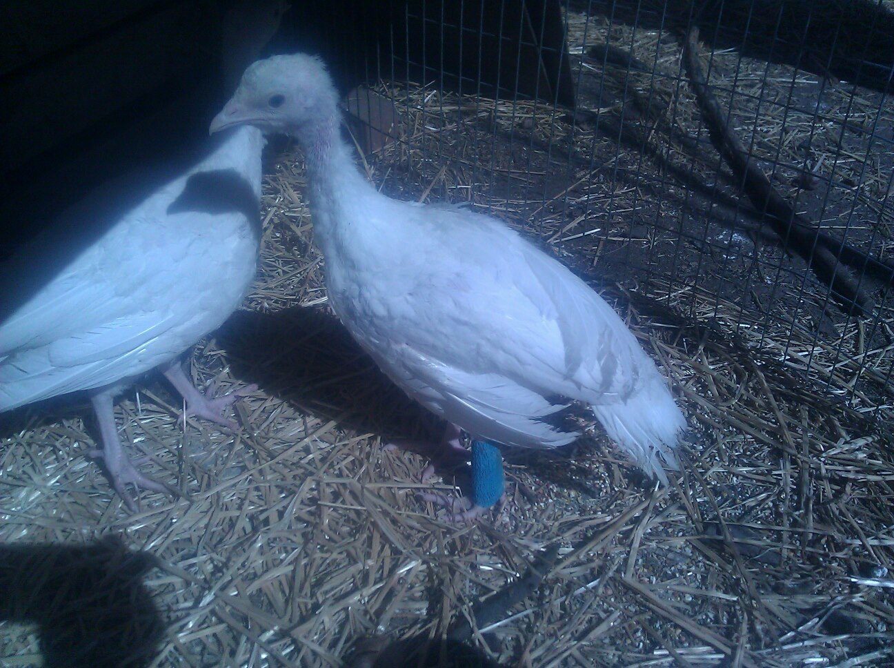 Well, here is a short tutorial on splinting a turkey leg. All in all we've found it's hard to know if your bird has a broken leg unless it's really badly broken. Since their bones are so small and fragile it doesn't look like much except a bit of a bump. Before we first splinted the leg on this girl it had turned blu-ish and was very swollen. These pics are from the third day of treatment.