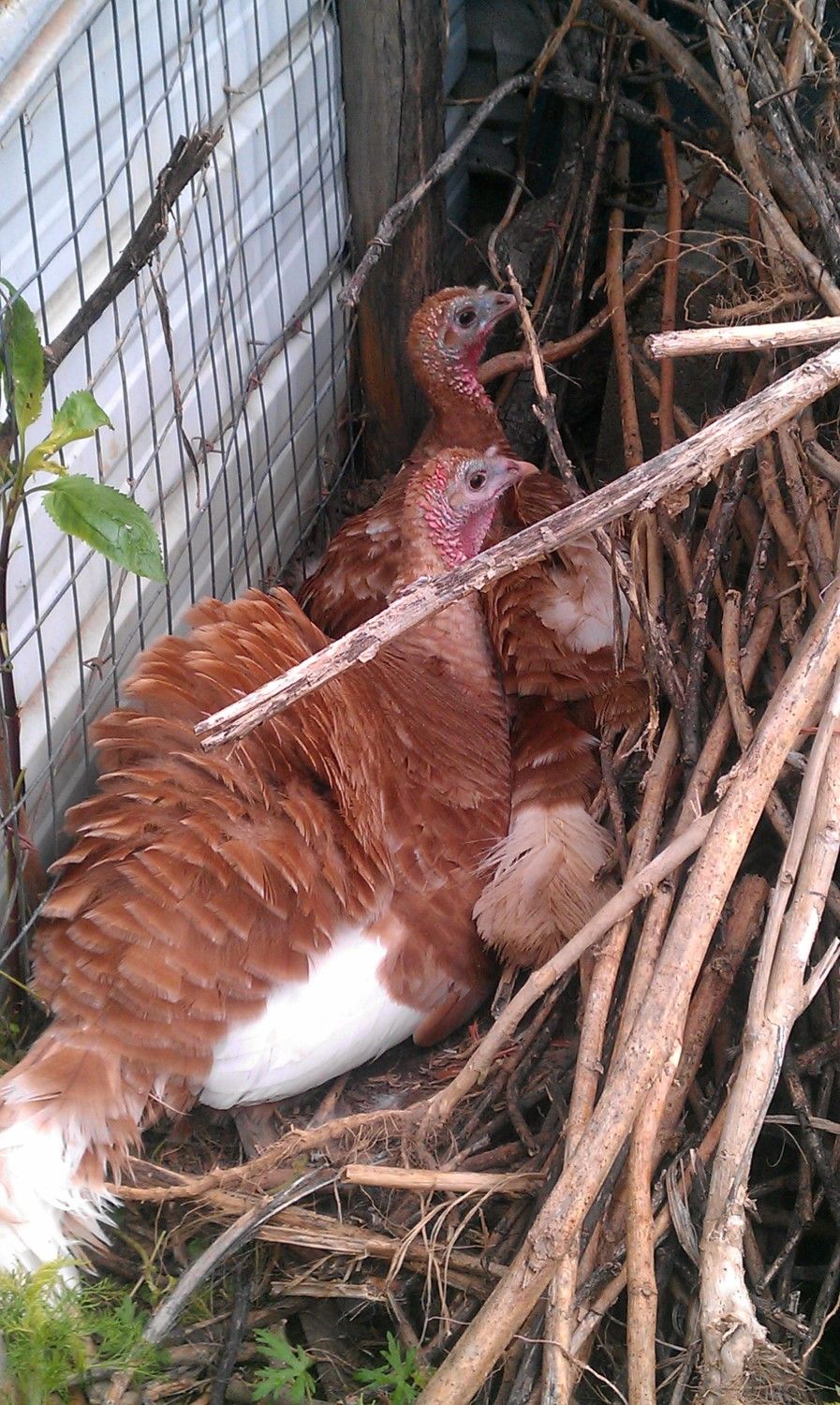 Found these two convicts setting on eggs at the neighbor's house. Looks like they are on about 30 turkey eggs.