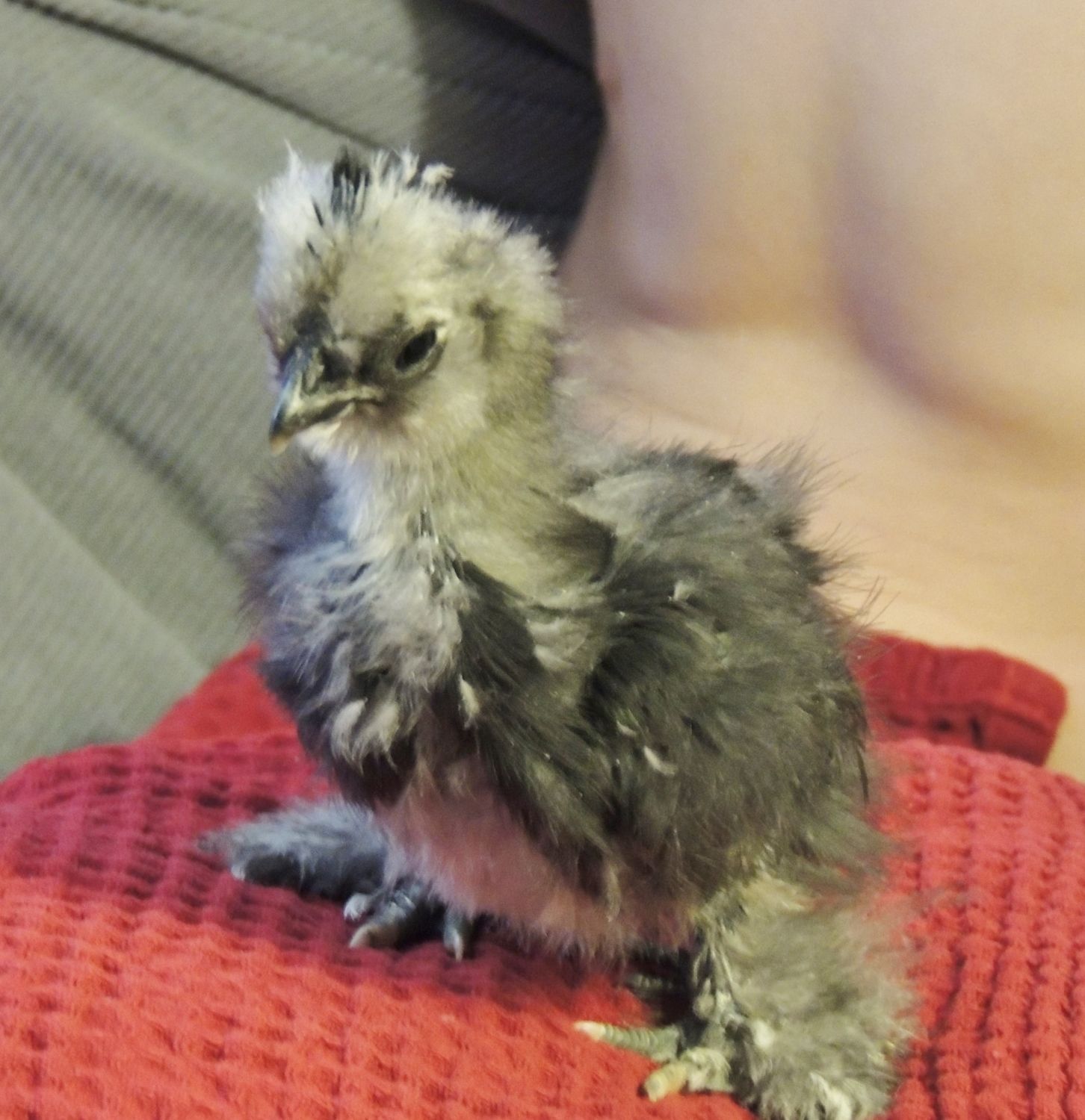 For the very first time I bought a doz of eggs coming from Maine to half way across NY State. All arrived intact and I was thrilled. I left them sit on the counter pointy end down for 2 - 3 days. I stuck them in the incubator and candled them for the first time at 7 days. A lot of them looked squishy or scrambled but I left them. At 17 days I candled again. 8 had done nothing. When I cracked them open, they were literally scrambled. Out of the remaining 4 2 looked iffy and 2 looked great. On day 24 one pipped and by the next day I had a Silkie. BUT, when the little chick came out of the shell, he flew out with force and created a hole in the shell of the only other living chick there was. I should have helped the chick out but didn't and he died several hours later. (I named my living Silkie, Thor, the Hammer. lol) The woman I bought the eggs from asked if I would let her know how things worked out and if she could post it on her facebook page. (I only got 1 chick out of a doz. I'm not really a Silkie person but I have a Sizzle and wanted another her size) So, you know what I did, after all that? I contacted the woman and said "Yahoo! I have a Silkie and his name is Thor. I'm so happy and thank you so much for sending the eggs. I'm not disappointed because I only got one because he is so beautiful. You can, by all means post his picture" And she did. It was not her fault the eggs got scrambled. They were pkg. very nicely. At that same time I bought another dozen, shipped from south of me, can't remember. Same thing happened. Out of 14, 8 were so scrambled but the remaining all hatched. I think that if you buy eggs to be shipped through the mail, you can write FRAGILE as many times as you want but the postal workers don't pay attention. I doubt that I'll buy eggs that have to go through our USPS again but it was fun. (Thor is looking like he's going through teen years. A little out of sorts and awkward.) Not Thor's best looking photo. Mitten's the cat was ready to pounce on him and my 5 yr old grandson was trying to keep him contained.