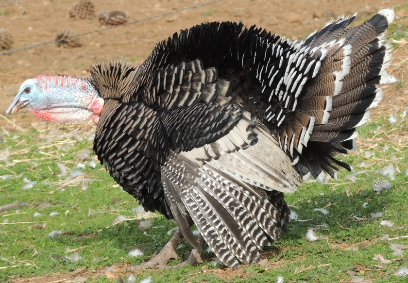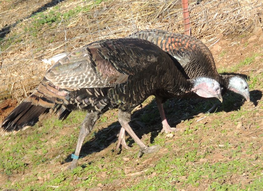 I have a pair of Wild Turkeys... a Rio Grande Hen that I hatched 3 seasons ago (from an egg that a Wild Turkey Hen laid in a nest she was sharing with a friend's Guinea Hen!) paired with an Eastern Jake (that was given to me a few months back by a friend that bought several poults at a swap meet):