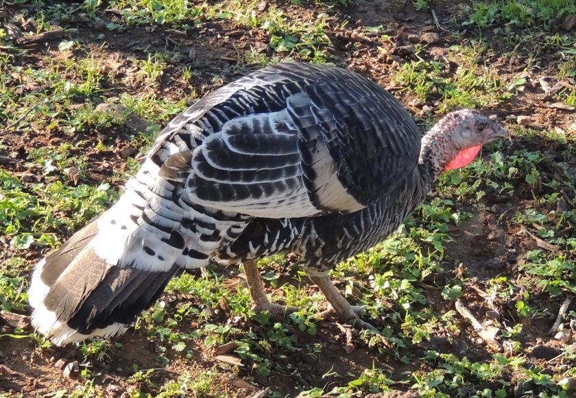 I also have a Narri Jake covering 1 young Narri Hen and 2 young Black somewhat mottled Hens (all siblings out of a Narri Hen X Blue Slate Tom pair). I hatched these 4 from some shipped eggs I received from a friend, hand raised them and they are the epitome of Turkey Puppies... they eat from my hand, want to be held whenever I am sitting down and will follow me around everywhere because they want to be near me constantly.