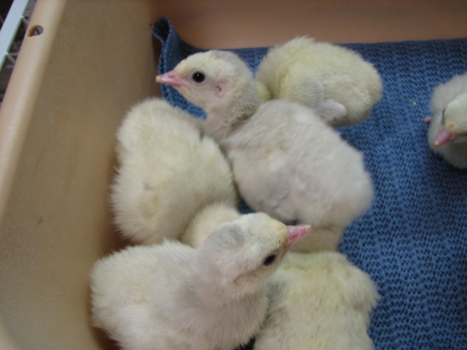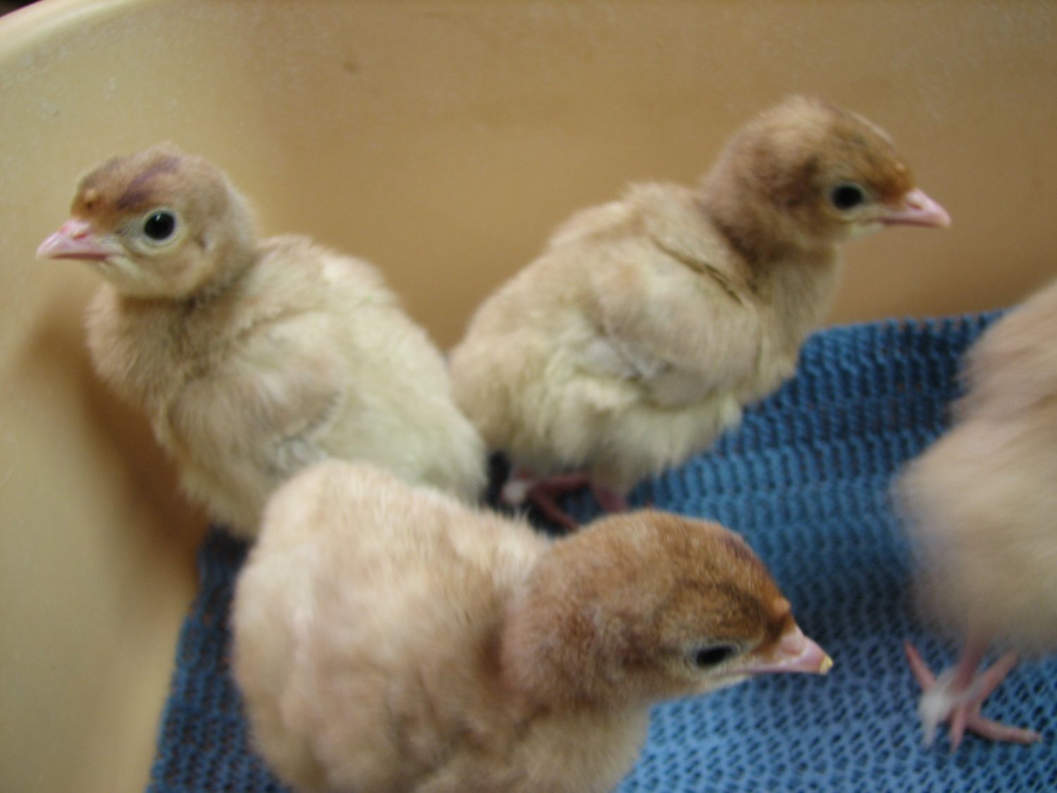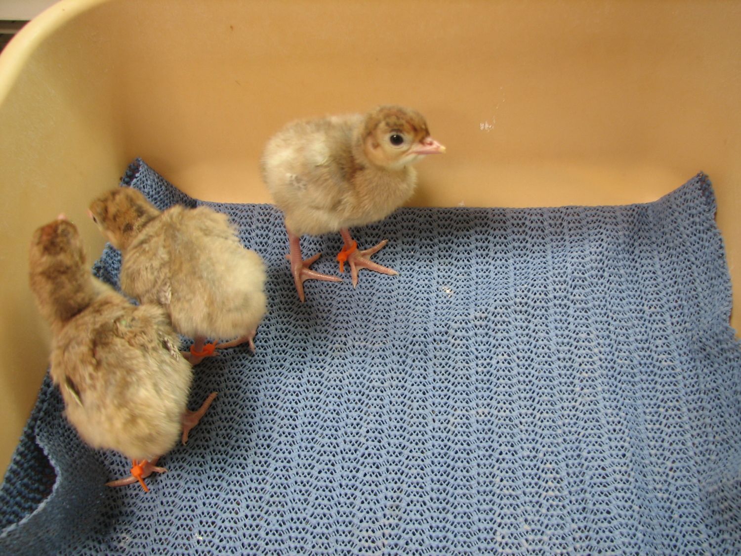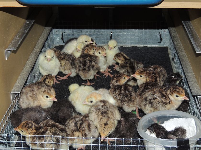 Here's my latest hatch of poults (still in the hatcher in this pic, they are in the brooder now)... 25 poults out of 26 eggs. The little guy in the cup had a rough hatch, and needed help... after he finally climbed out of his shell he had a pretty wet/rough navel, so I put him in the cup for a while to keep the other's from pecking at it while he dried and fluffed. Seems fine today, navel dried up and nobody's bothering/pecking at it. This time I banded the legs of the RioXEastern poults, so I can easily tell them apart from the Narris if I decide to sell some of these guys young.