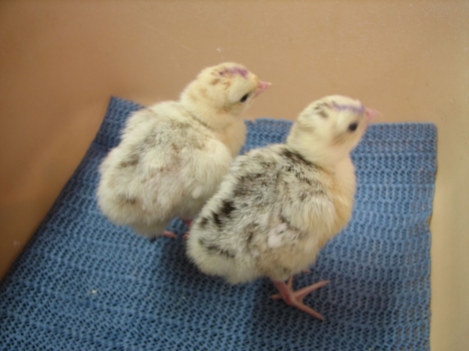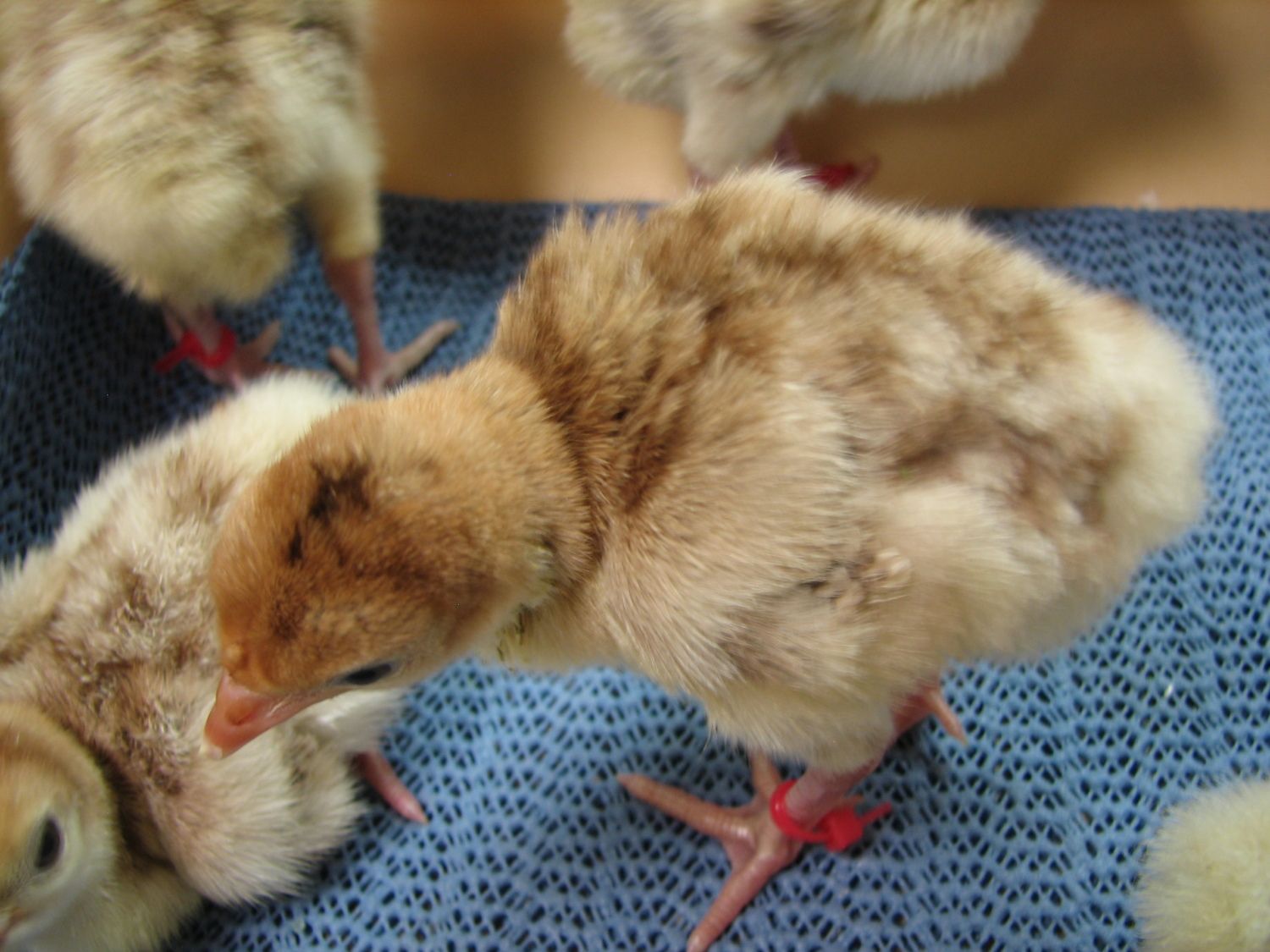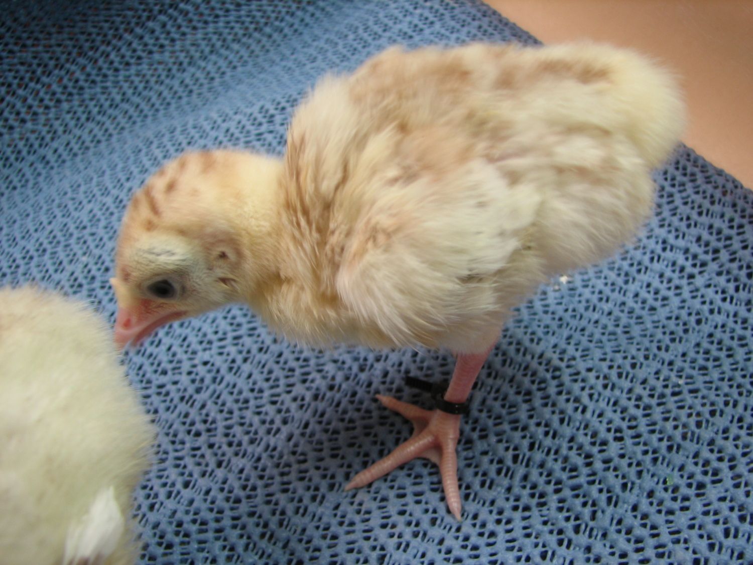 Here's my latest hatch of poults (still in the hatcher in this pic, they are in the brooder now)... 25 poults out of 26 eggs. The little guy in the cup had a rough hatch, and needed help... after he finally climbed out of his shell he had a pretty wet/rough navel, so I put him in the cup for a while to keep the other's from pecking at it while he dried and fluffed. Seems fine today, navel dried up and nobody's bothering/pecking at it. This time I banded the legs of the RioXEastern poults, so I can easily tell them apart from the Narris if I decide to sell some of these guys young.