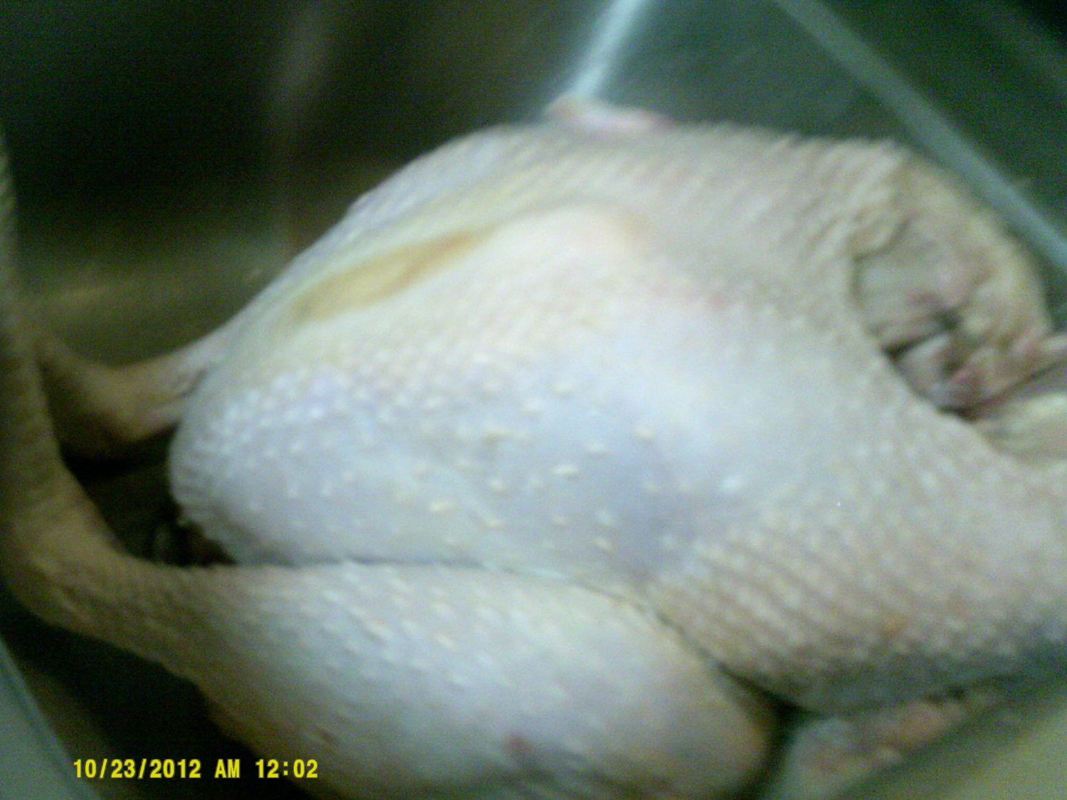 I found the cord, and as you can see, at 15 1/2 pounds processed weight, his chest is not filled out yet, at about 6 to 7 months: