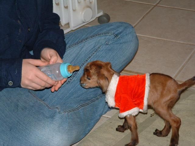 THat tiny goat is precious!! Love the Santa outfit. I kept my twins in a cardboard box-- it was a long time before they had the ability to hop out. Figured then it was time to go back to the barn.