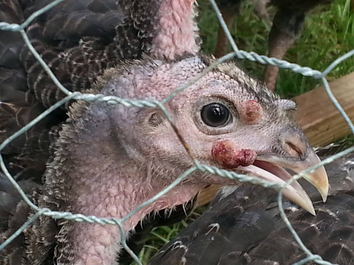 The scabs may get bigger, and cover more of your turkey's face. They may block their vision, making it difficult for them to see to eat and drink. To make them more comfortable, mix together some vaseline with sulphur (I believe that sulphur can be found at garden stores, but I'm not sure). Put this mixture on the scabs, and they will soften so that you can remove them. Without the scabs, they will be able to see to eat and drink, and the sulphur will help repel flies.