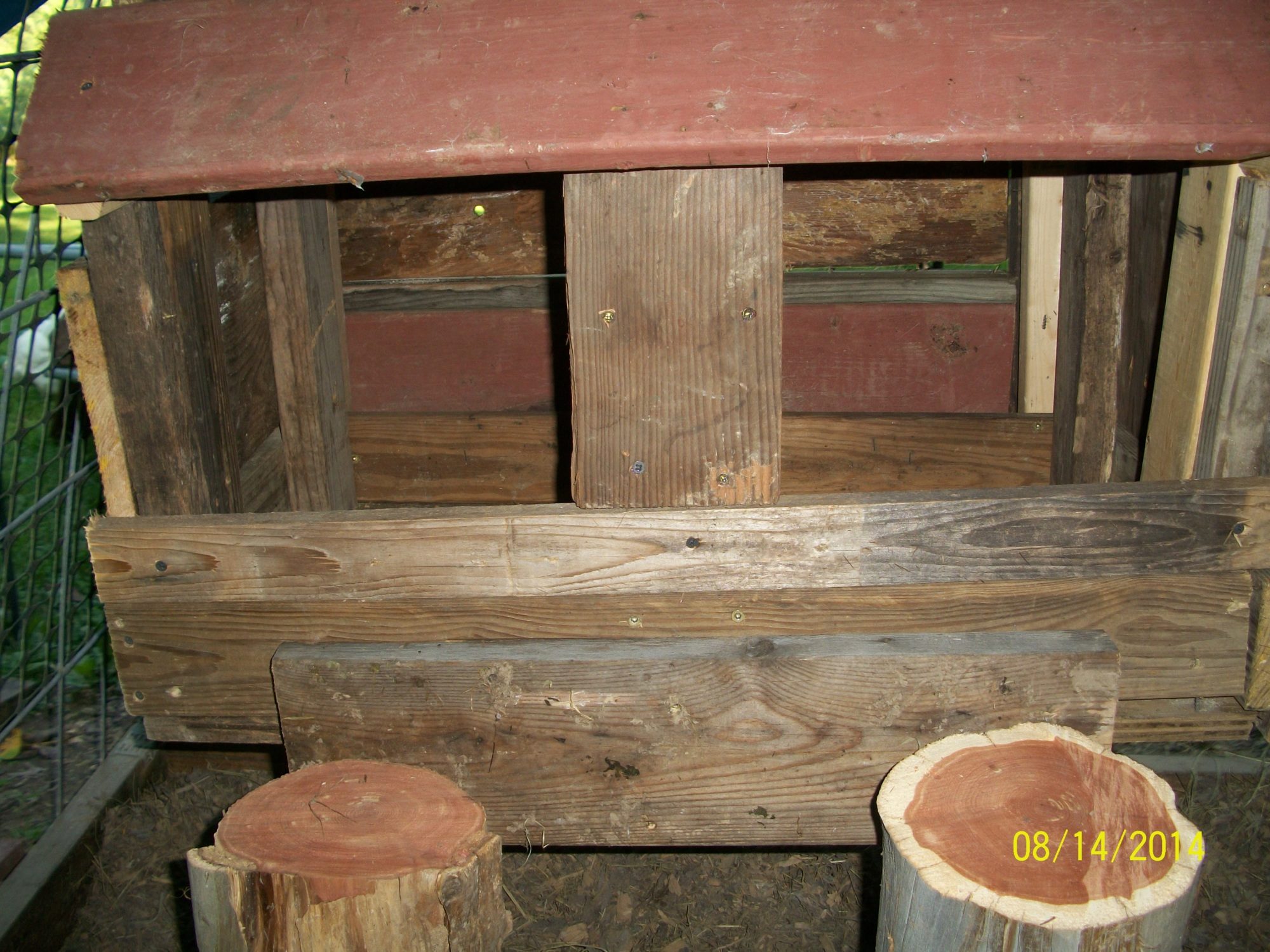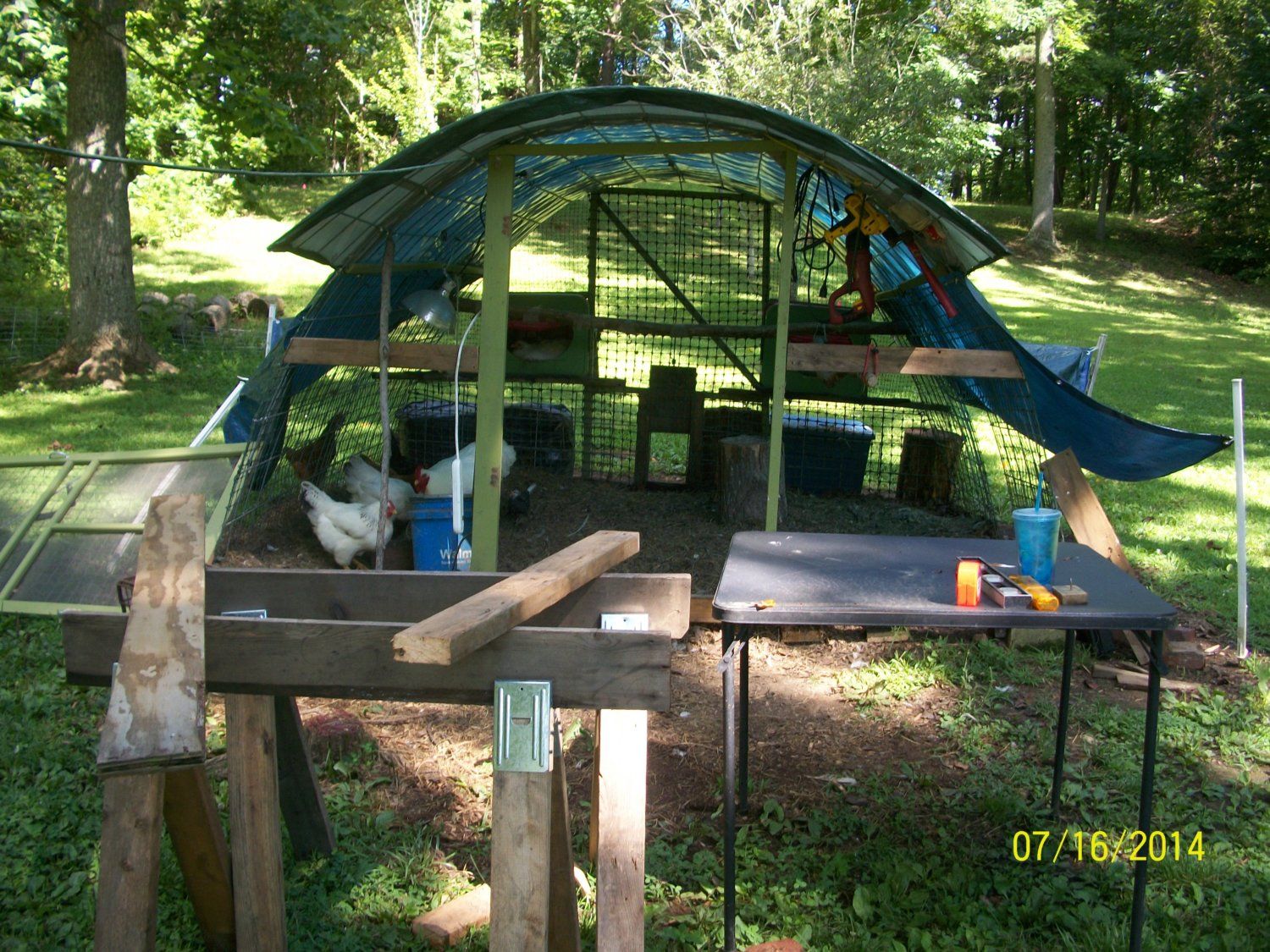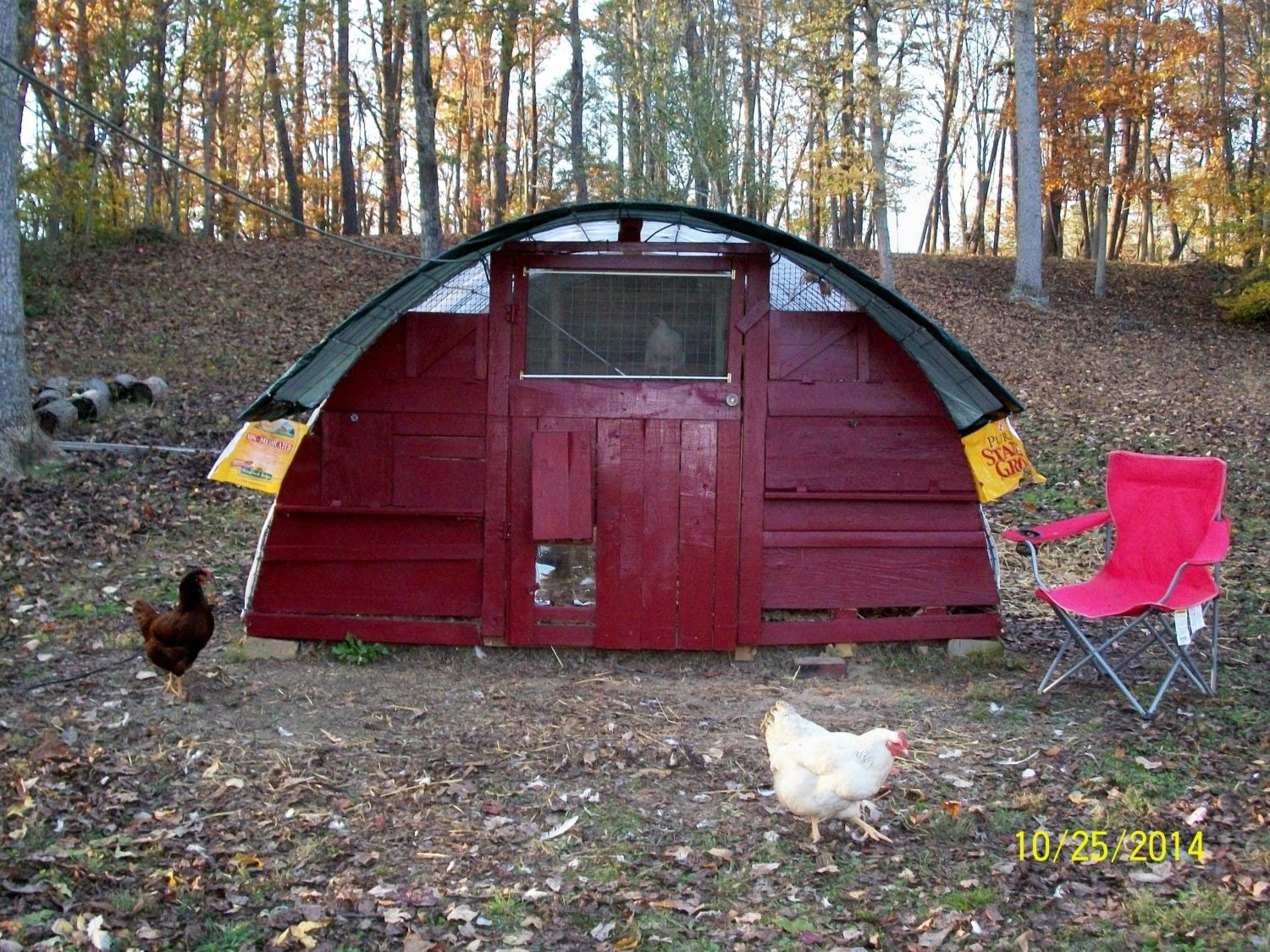 " .. I pretty much got an old coop .. that didn't have any laying boxes or even roosts .. basically it was a simple wooden frame with wire on it .. here is a link to some videos of what i have .. I am like you beekissed and others .. I try to do things wayyy cheap by finding things others might throw out (and did)Hi BeeI never really posted back to this thread about the changes made to my coop, all on the cheap. I used scrap lumber from various things...old fences, many scraps from broken down wooden crates from back in the 50s-60s, other lumber from that era~read TOUGH...too tough to get a nail into and many holes for screws had to be predrilled. The only new lumber was some 2x4 for framing and such. [COLOR=008000]Now don't all you fellas laugh at my crude construction....I'm just a woman with old tools, old materials and very little know-how, so I do the best I can to build it strong but don't often worry about the finer details. [/COLOR]I added another hoop to the back of the coop and enclosed the ends with wood. I also built a dog house on the back of the coop, big enough for two dogs, of pallets stuffed with hay for insulation. I'll post pics of the transition from green and basic coop to red and bigger coop/dog home. Tore the front off, removed the 2x2 bracing and replaced with 2x4, also placed bracing all along the roof line.