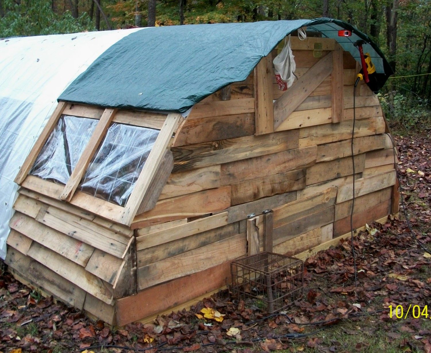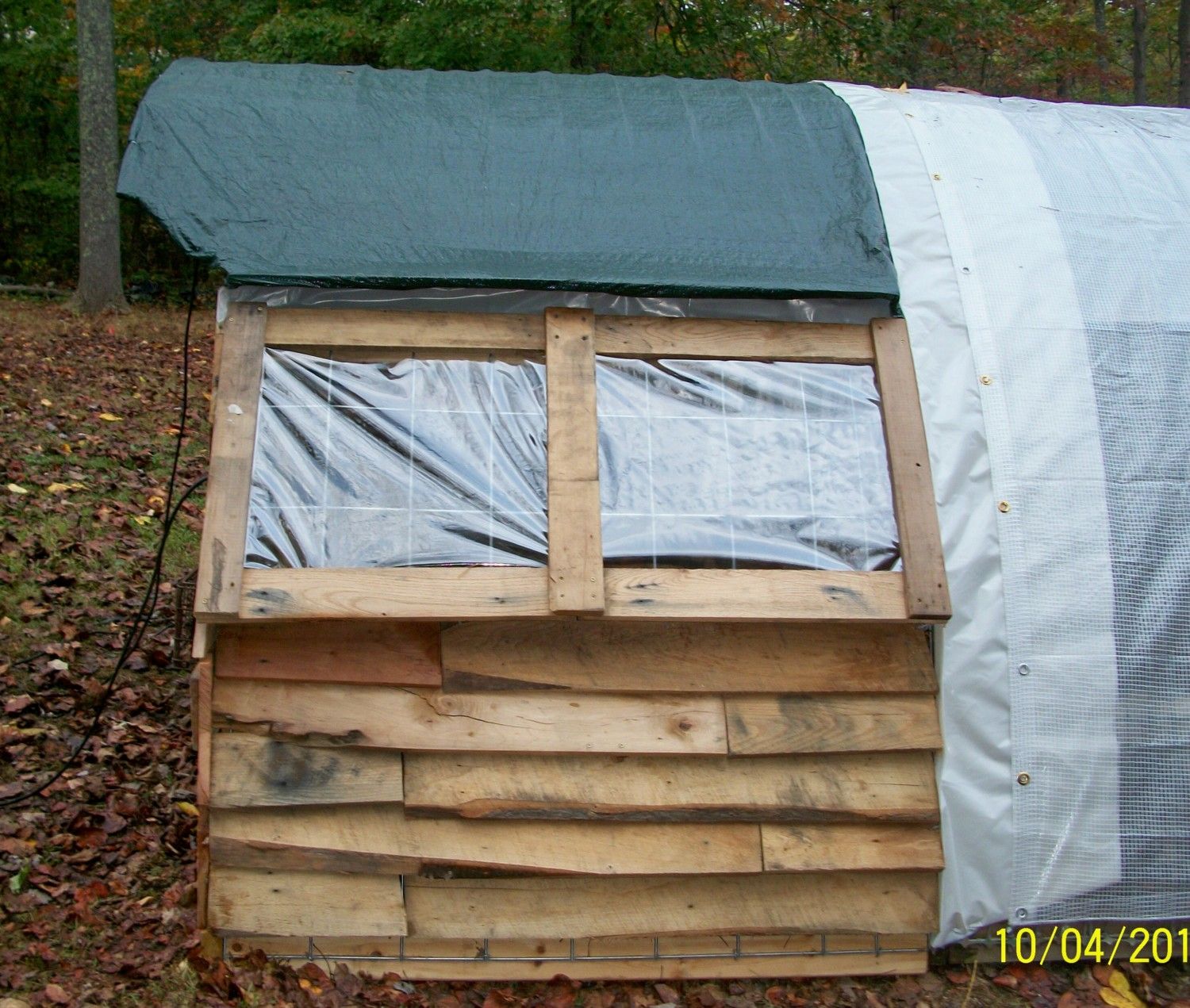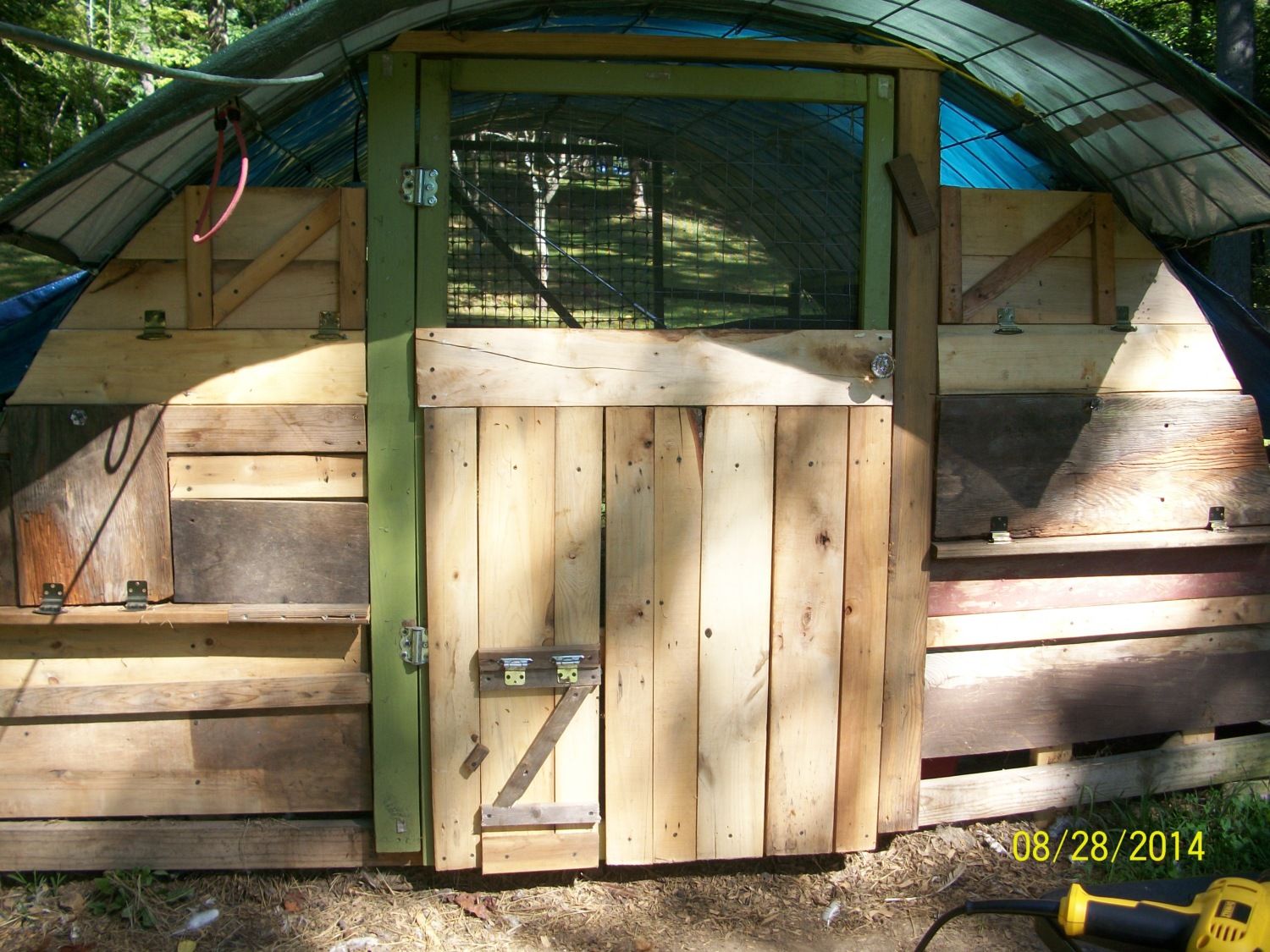 " .. I pretty much got an old coop .. that didn't have any laying boxes or even roosts .. basically it was a simple wooden frame with wire on it .. here is a link to some videos of what i have .. I am like you beekissed and others .. I try to do things wayyy cheap by finding things others might throw out (and did)Hi BeeI never really posted back to this thread about the changes made to my coop, all on the cheap. I used scrap lumber from various things...old fences, many scraps from broken down wooden crates from back in the 50s-60s, other lumber from that era~read TOUGH...too tough to get a nail into and many holes for screws had to be predrilled. The only new lumber was some 2x4 for framing and such. [COLOR=008000]Now don't all you fellas laugh at my crude construction....I'm just a woman with old tools, old materials and very little know-how, so I do the best I can to build it strong but don't often worry about the finer details. [/COLOR]I added another hoop to the back of the coop and enclosed the ends with wood. I also built a dog house on the back of the coop, big enough for two dogs, of pallets stuffed with hay for insulation. I'll post pics of the transition from green and basic coop to red and bigger coop/dog home. Tore the front off, removed the 2x2 bracing and replaced with 2x4, also placed bracing all along the roof line.