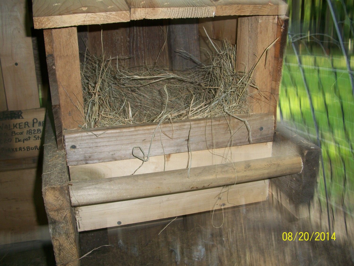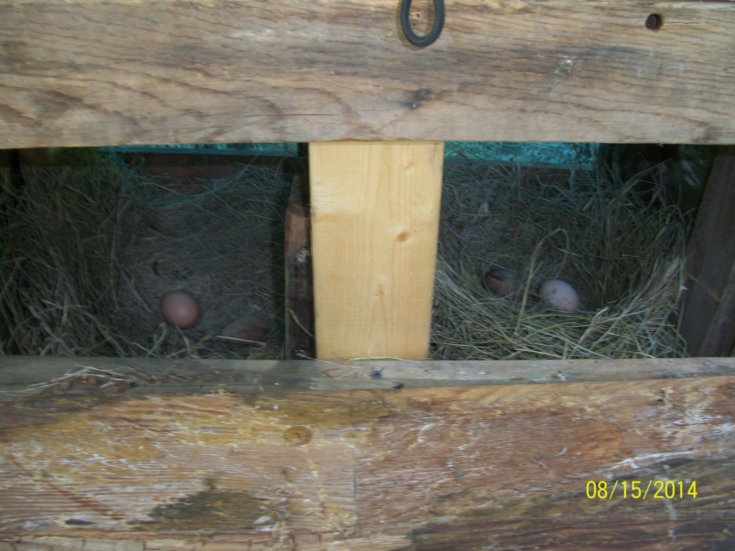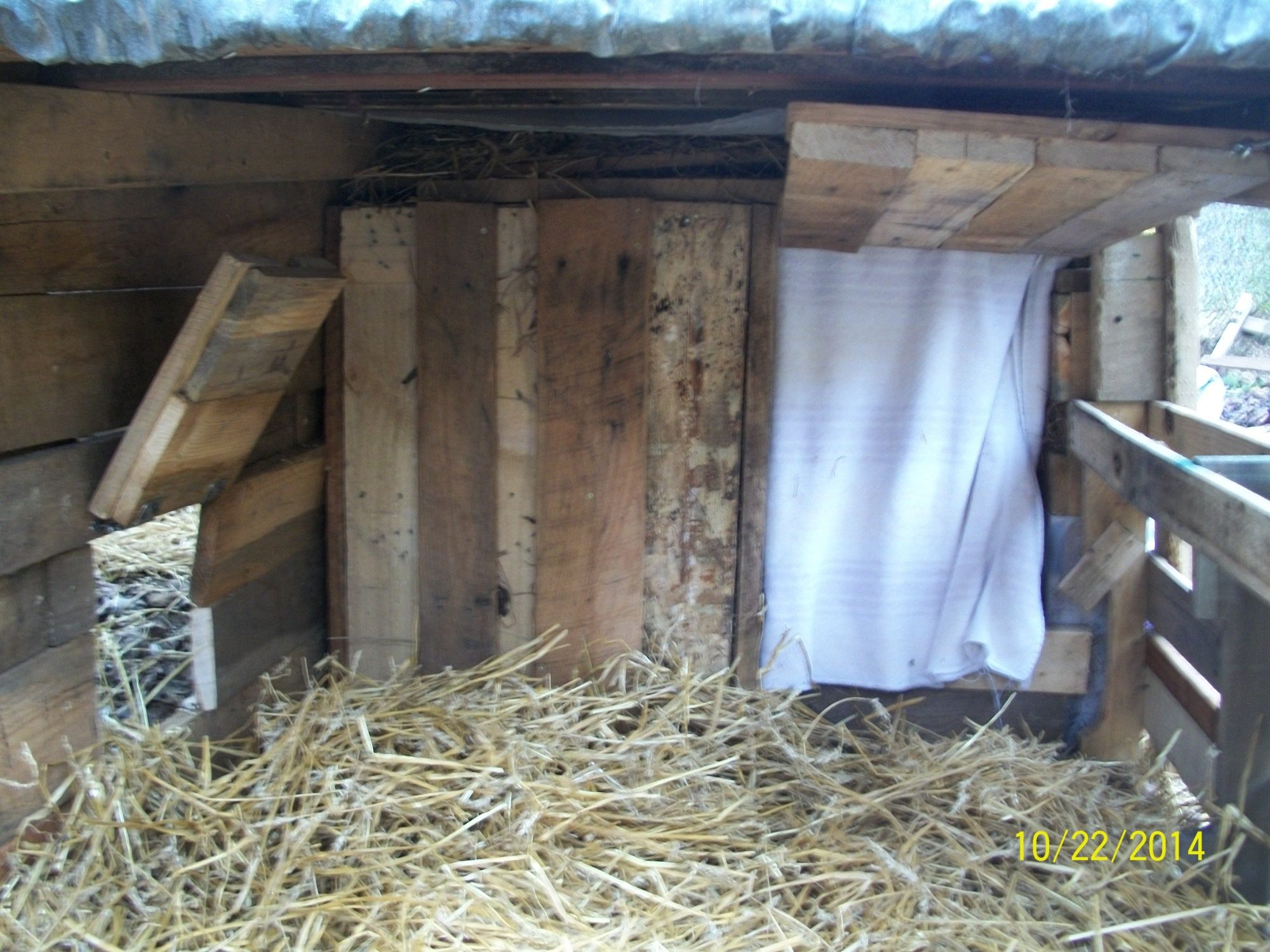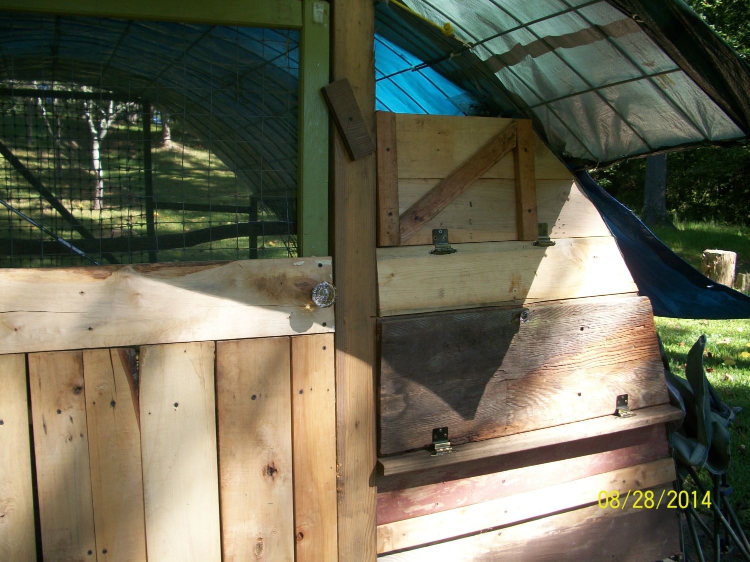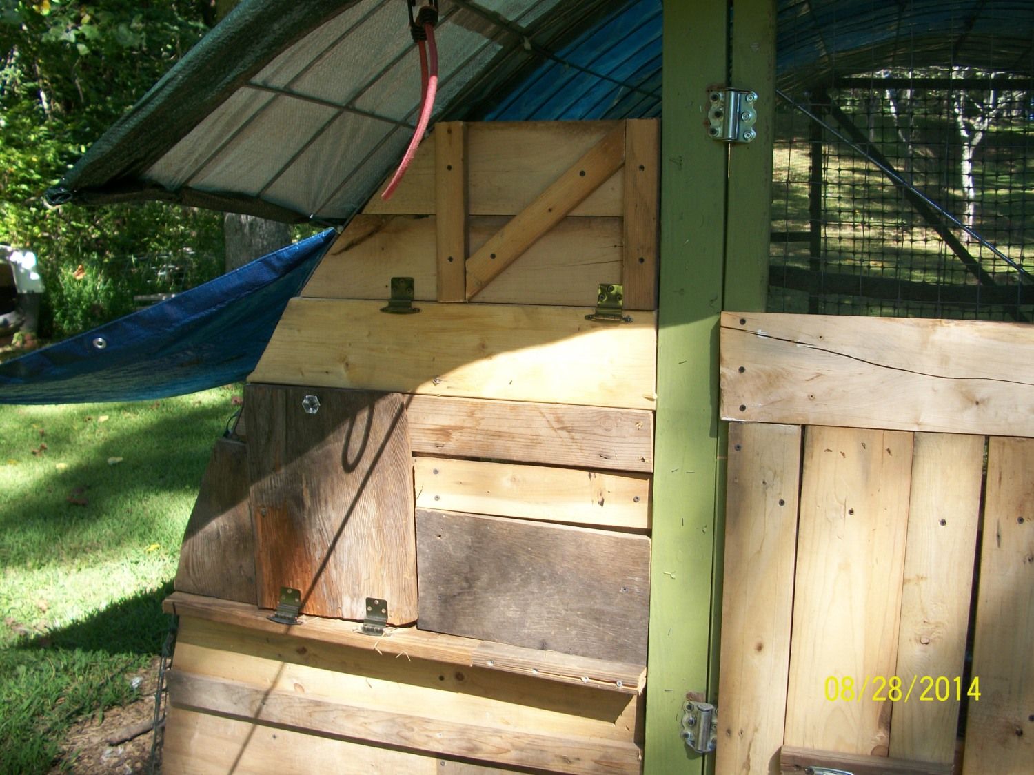 The hens didn't mind the cobbled up nature of their nesting...they really seem to love these better than those plastic totes from before. This is from the outside access.