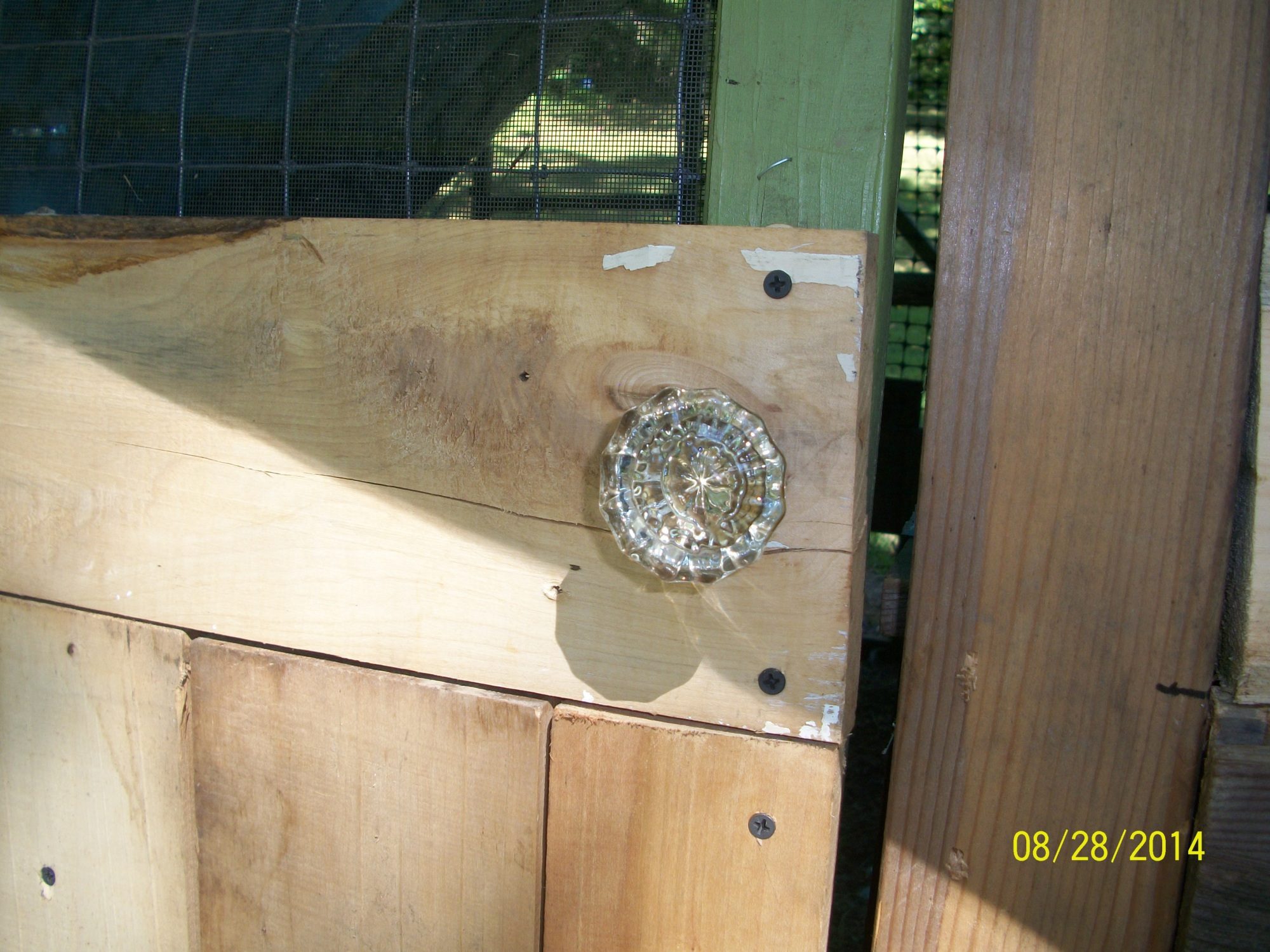A lot of the hardware for the hinges and such we already had, stored here and taken from this or that house/cabinets over many year's time. I loved getting to reuse them at last, here on this coop. The doorknob is an antique, glass doorknob set I found at a yardsale about 15 yrs ago and had been dragging it around ever since, knowing I'd find a use for it. Found some reproduction glass knobs for the nest box doors to match, so it all worked out.