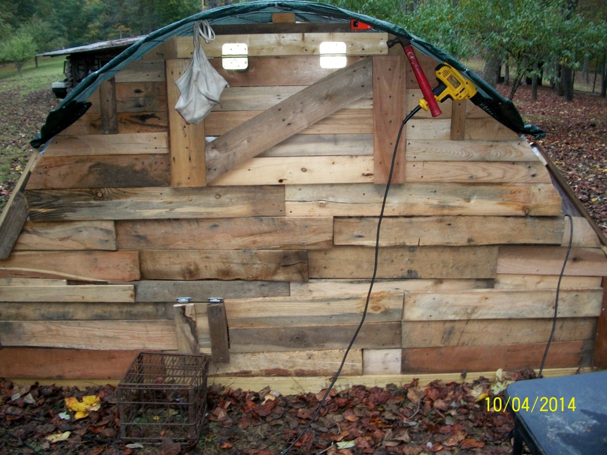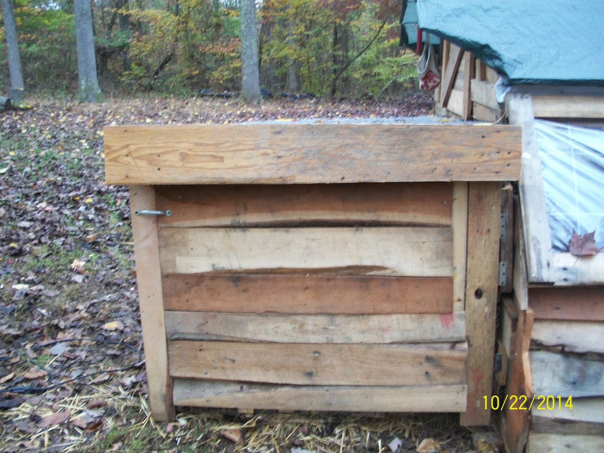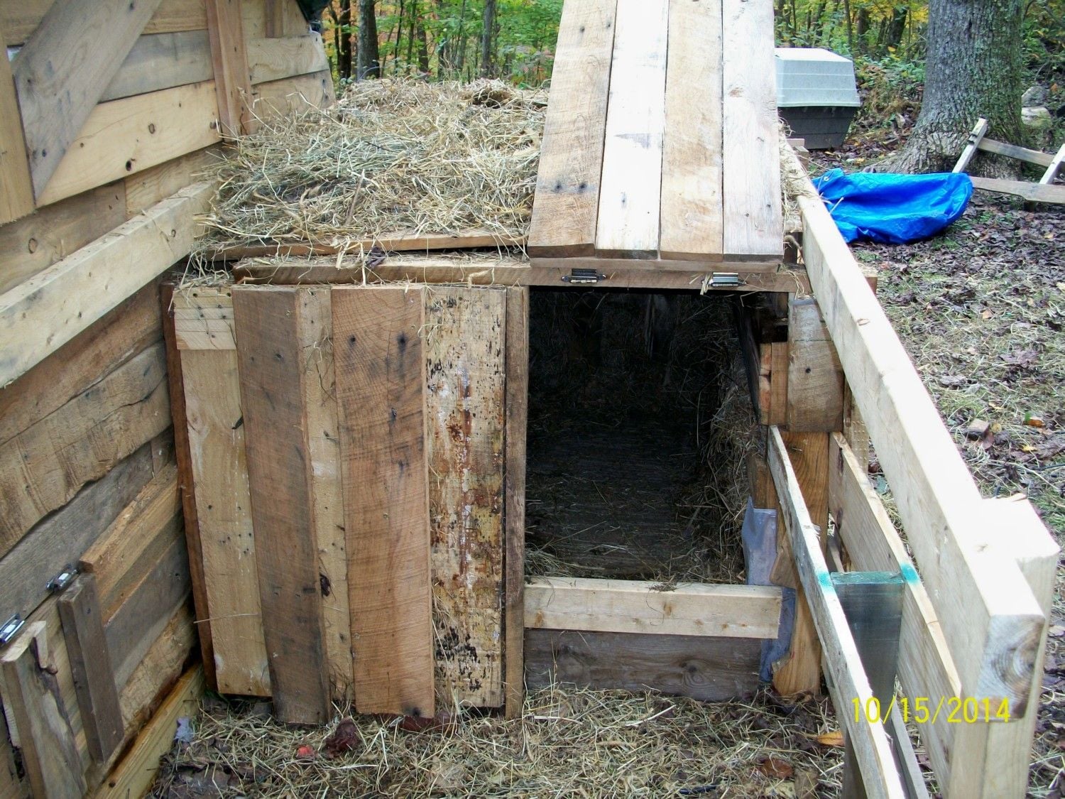 The back of the dog house is a full pallet, stuffed with hay and on hinges so it can be opened up for easy cleaning of the house.