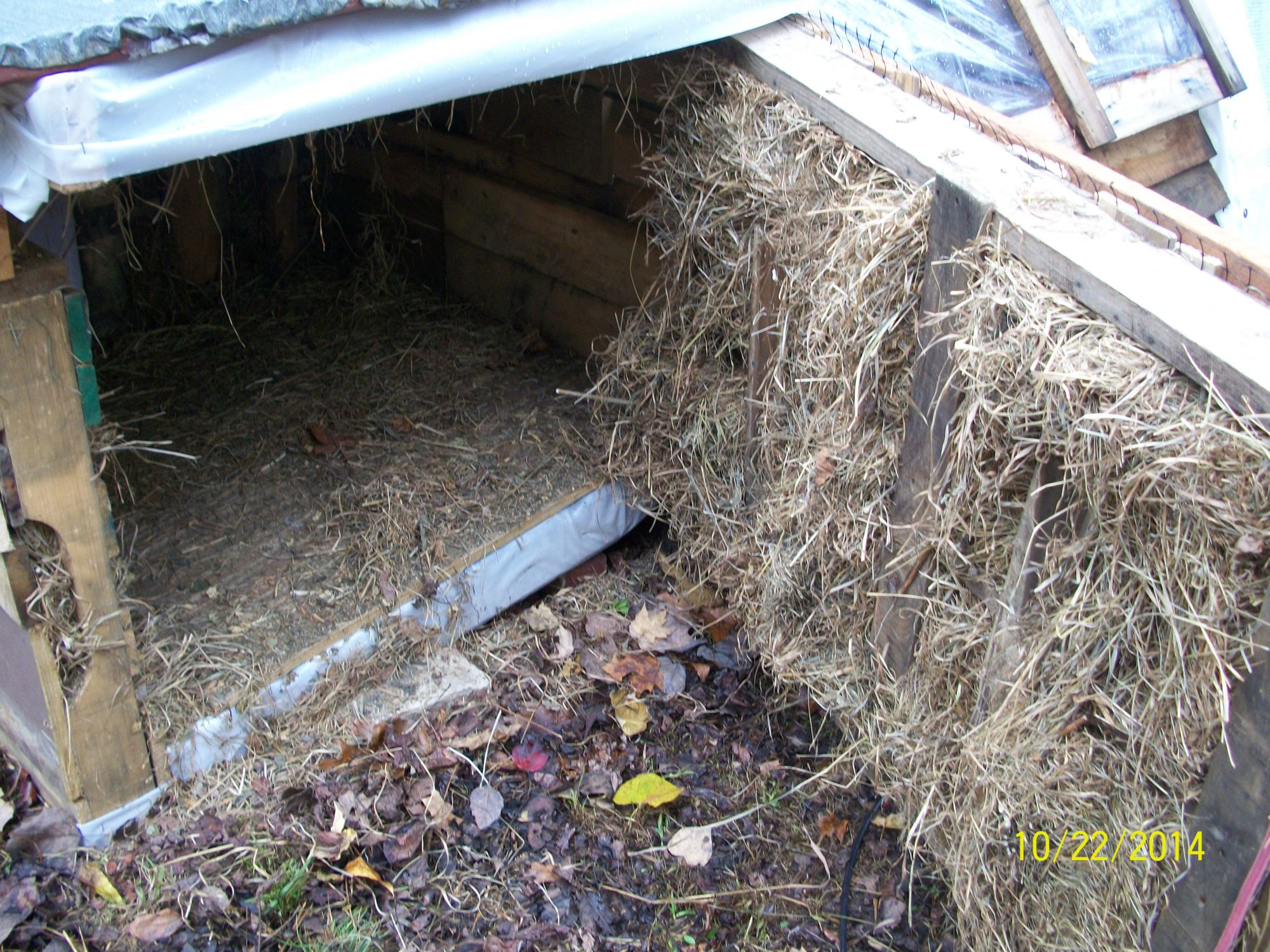 The dog house...mid construction, showing the hay insulation. Even the floor is made from a pallet stuffed with hay, lined with plastic on the bottom and sides, then topped with heavy plywood. Dry and warm, you might say.