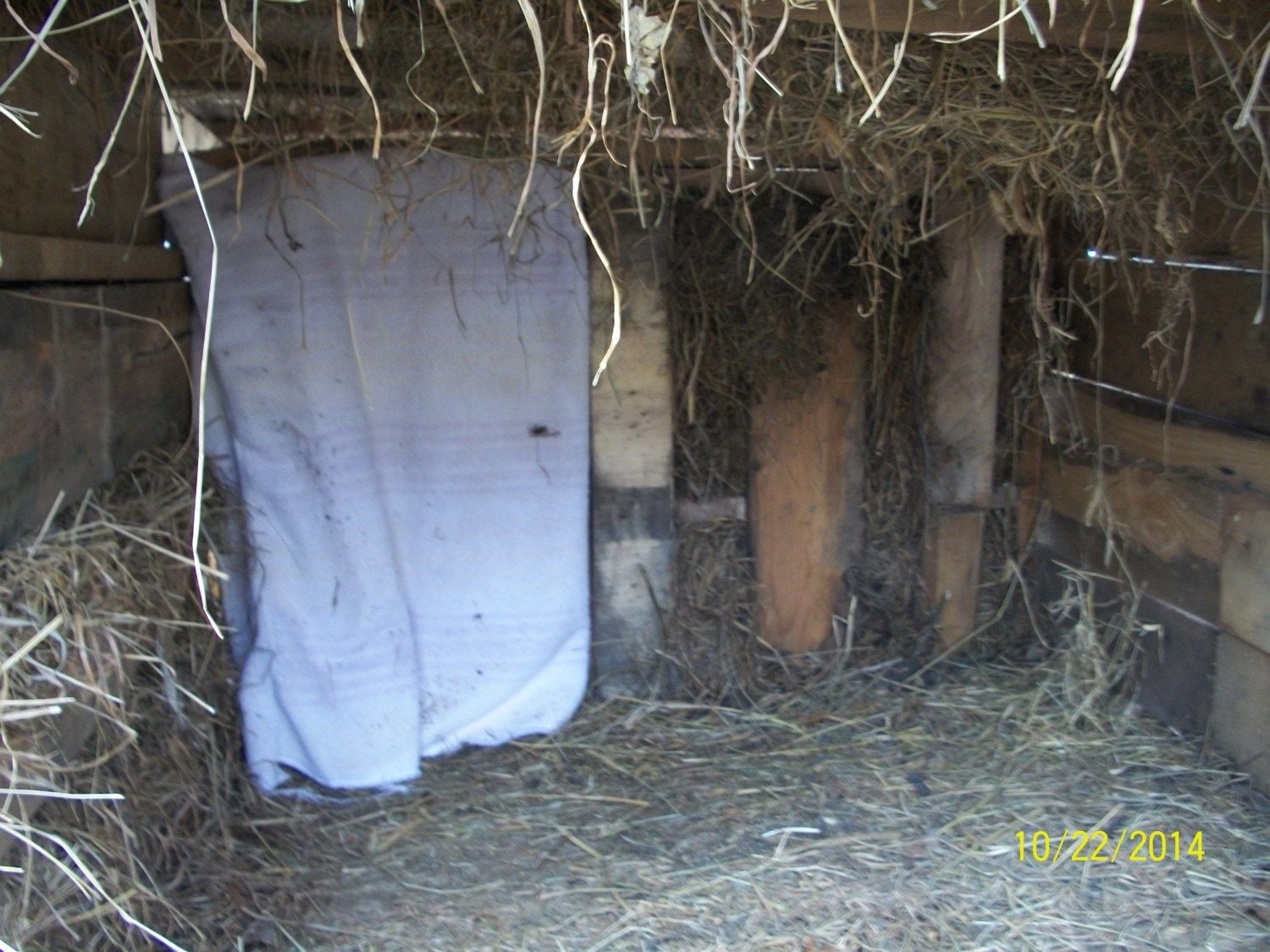 The interior, with a heavy two layer towel over the entrance. This dog house gets closed in the warm months, as Jake doesn't use it then and I don't want chickens laying in there. That's the reason for the heavy door on the front.
