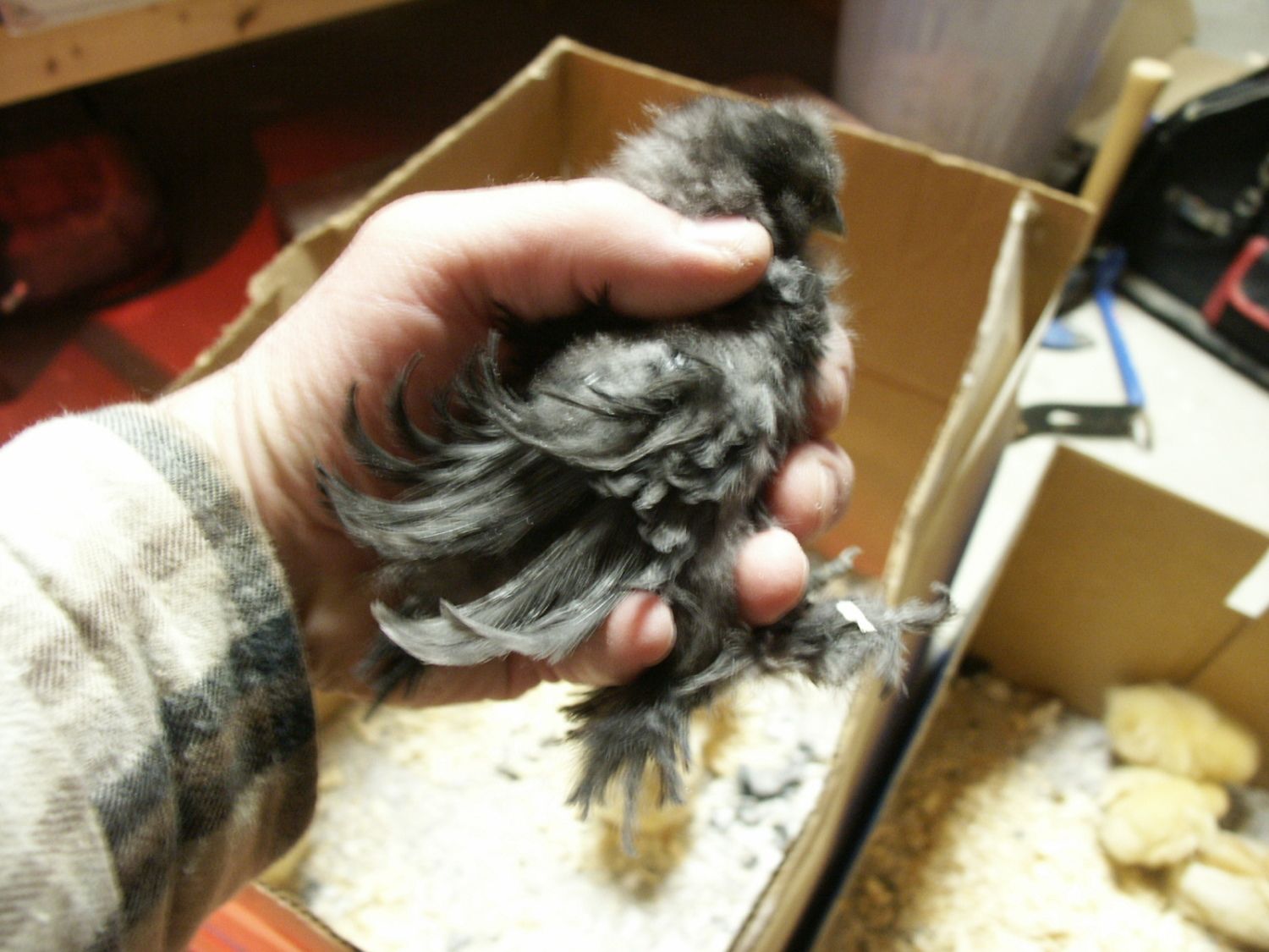 Below is the Silkie I found the single louse on. Are they really supposed to look this crazy with the curly feathers or is she perhaps the original bearer of the lice? The other Silkie is calmer and less wild/ un-kept (This one is so SPASTIC my buddy who gave her to me named her "Tweak" which is very fitting)