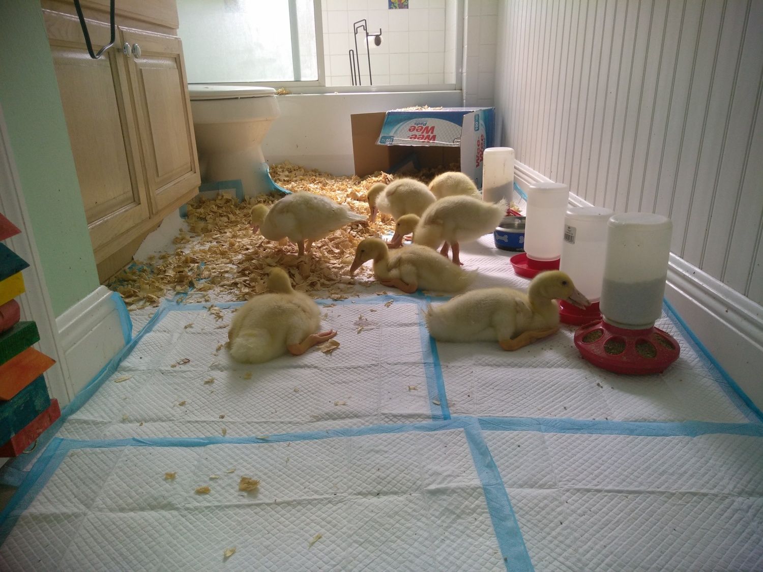 Do you have a duck house outside? they are growing so fast they will be feathered in and ready for it soon. lolThey go back and forth between my bedroom and the bathroom