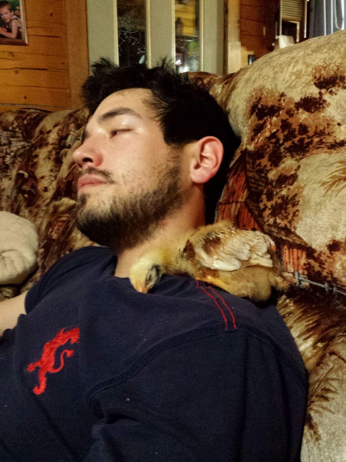 Here's a couple. One sunbathing under the heat lamp and the other is sleeping on my fiancé. She had blue cheeks from putting blu kote on her to heal from being pecked by her ear.Her name is Mimi like the girl from the Drew Carey show with the bright blue eye shadow.