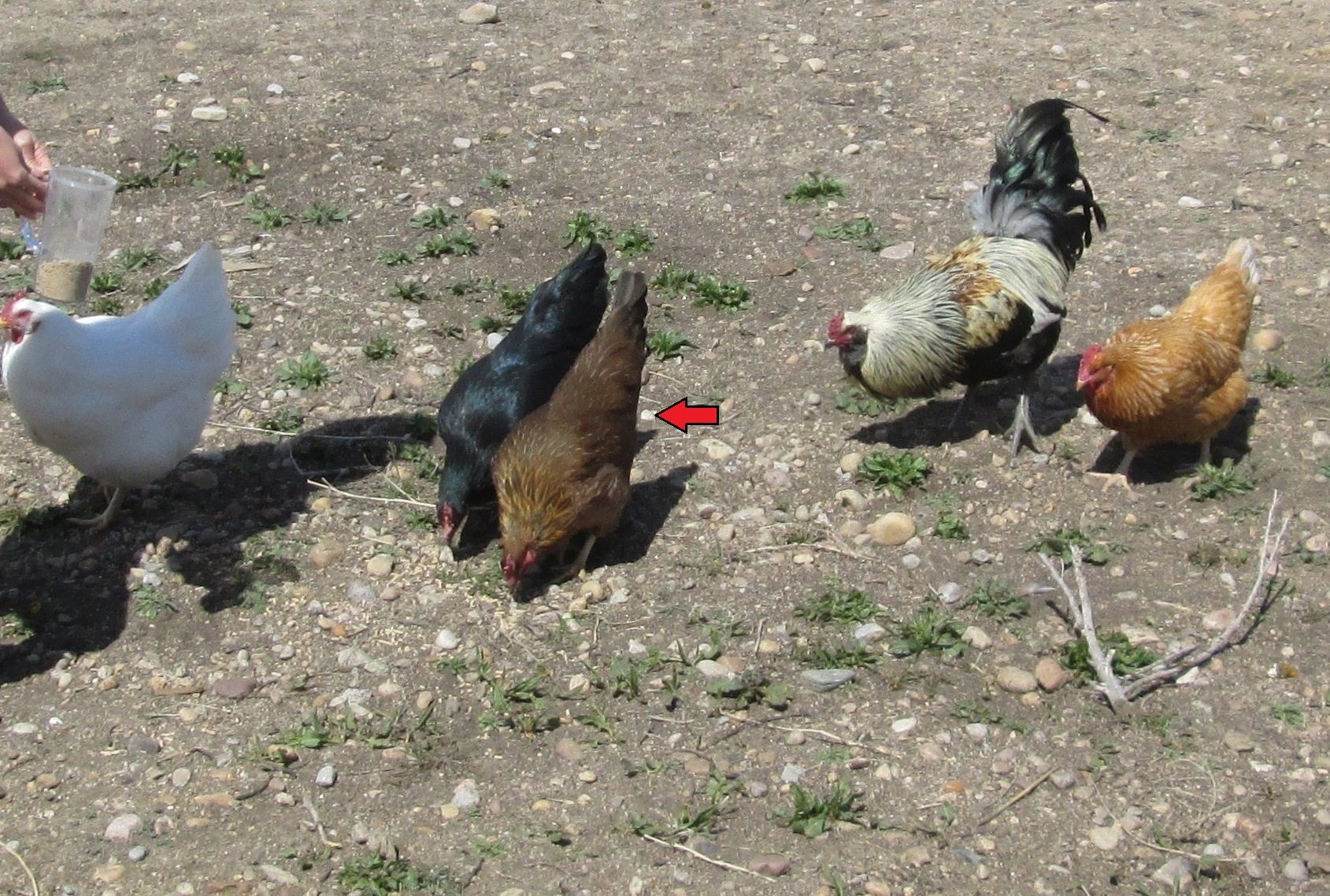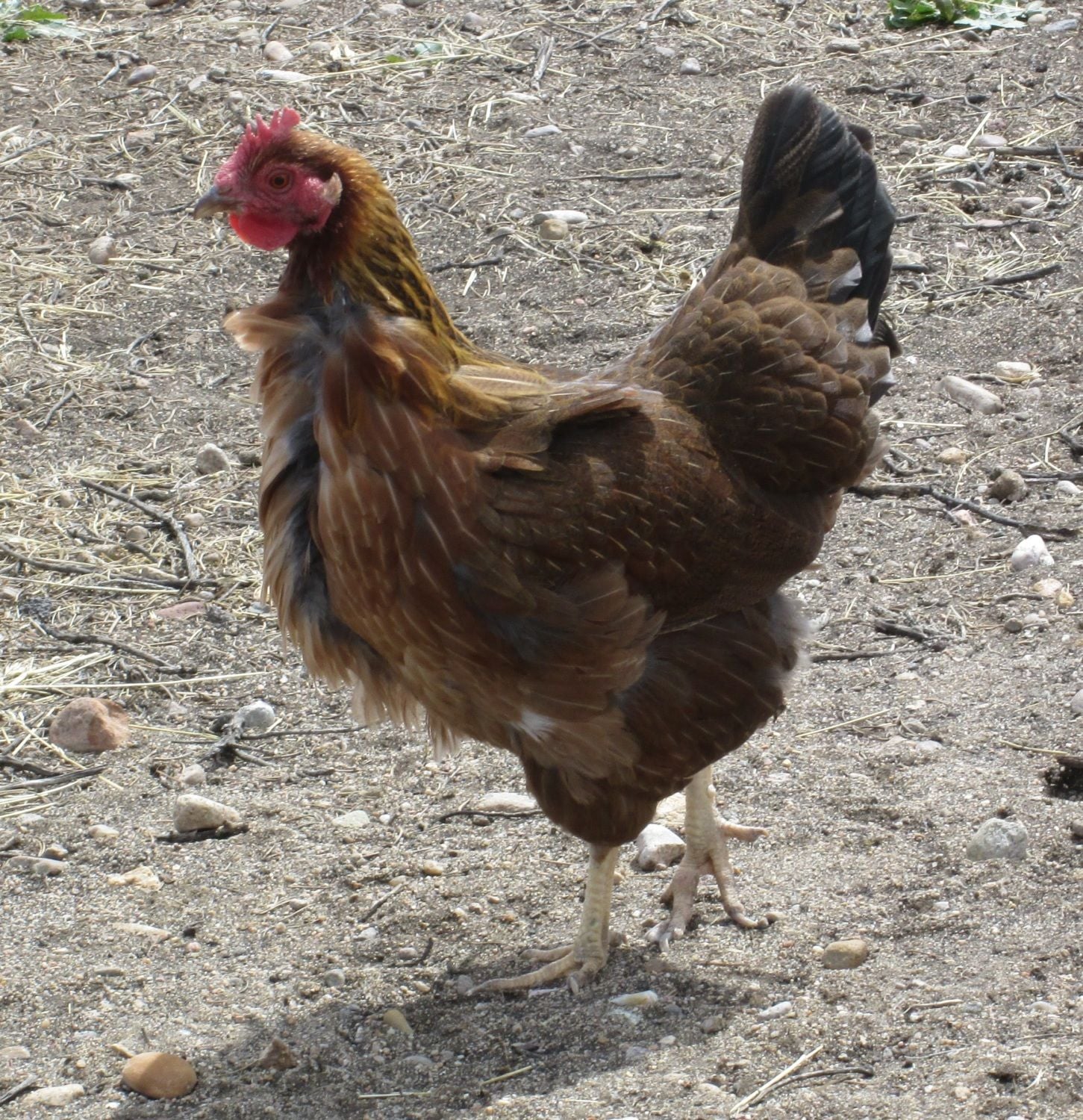- Side note: The black hen that is also two years old is now fuller and bigger next to her, and probably not due to coincidence, that one has been pecking at/picking on our Welsummer since the rooster's arrival (i.e., competing in the order). She snaps whenever the Welsummer tries to eat or drink, but it's not too aggressive and it's not consistent. (We are monitoring that!)