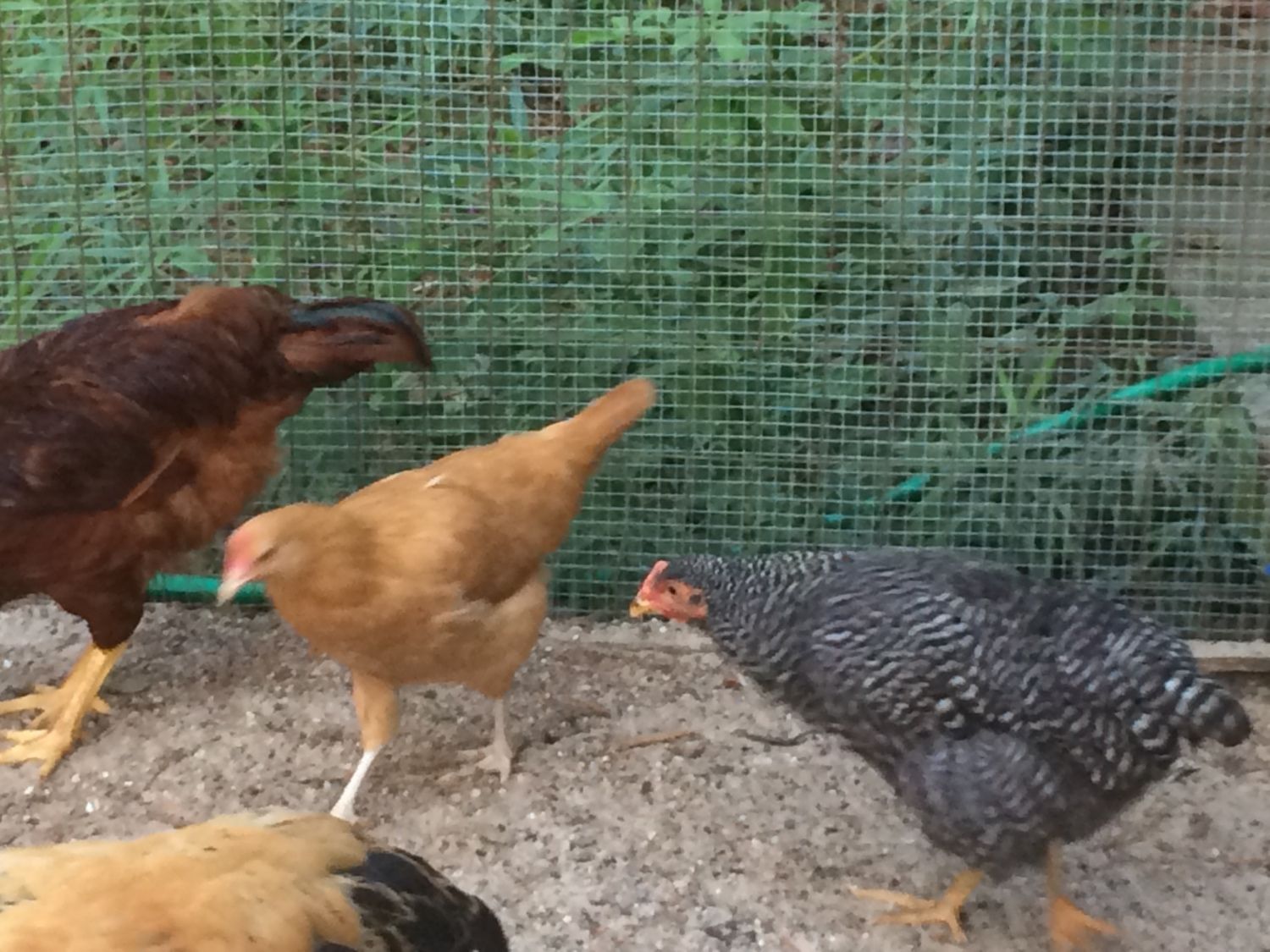 Pullet in the middle- gray legs, slim body, perky tail (usually sticks up quite a bit), smallest of flock by far