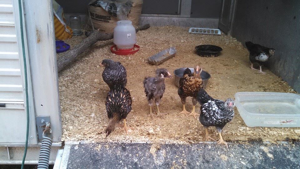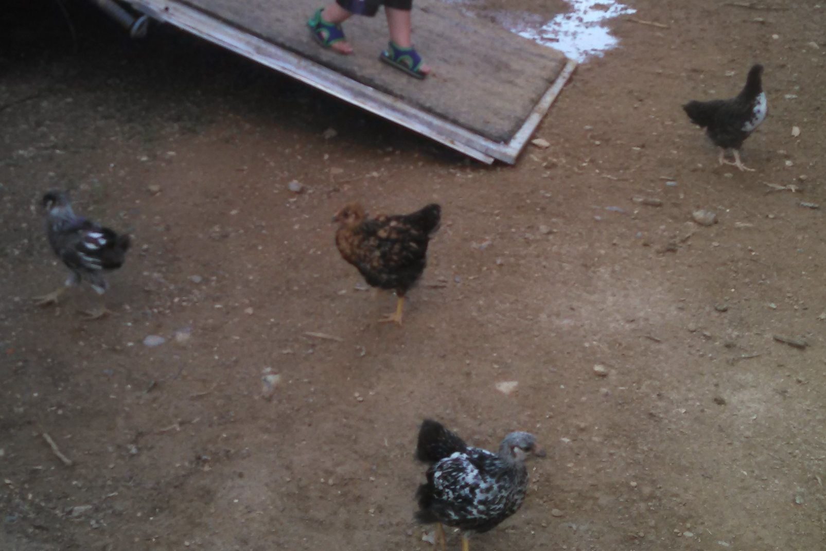 My daughter in law bought these 6 chicks 4 1/2 weeks ago. As you can see, one is quite ugly when comparing it with the others! I think it might be an Araucana - any other guesses?