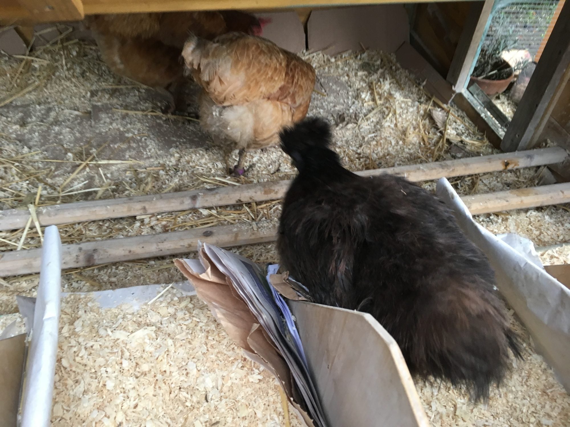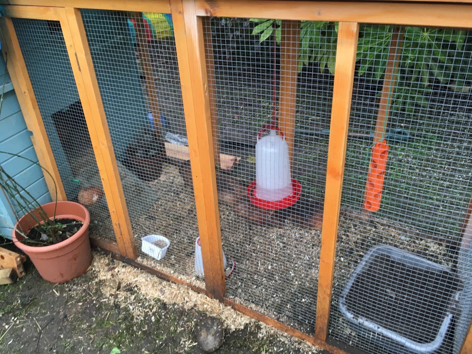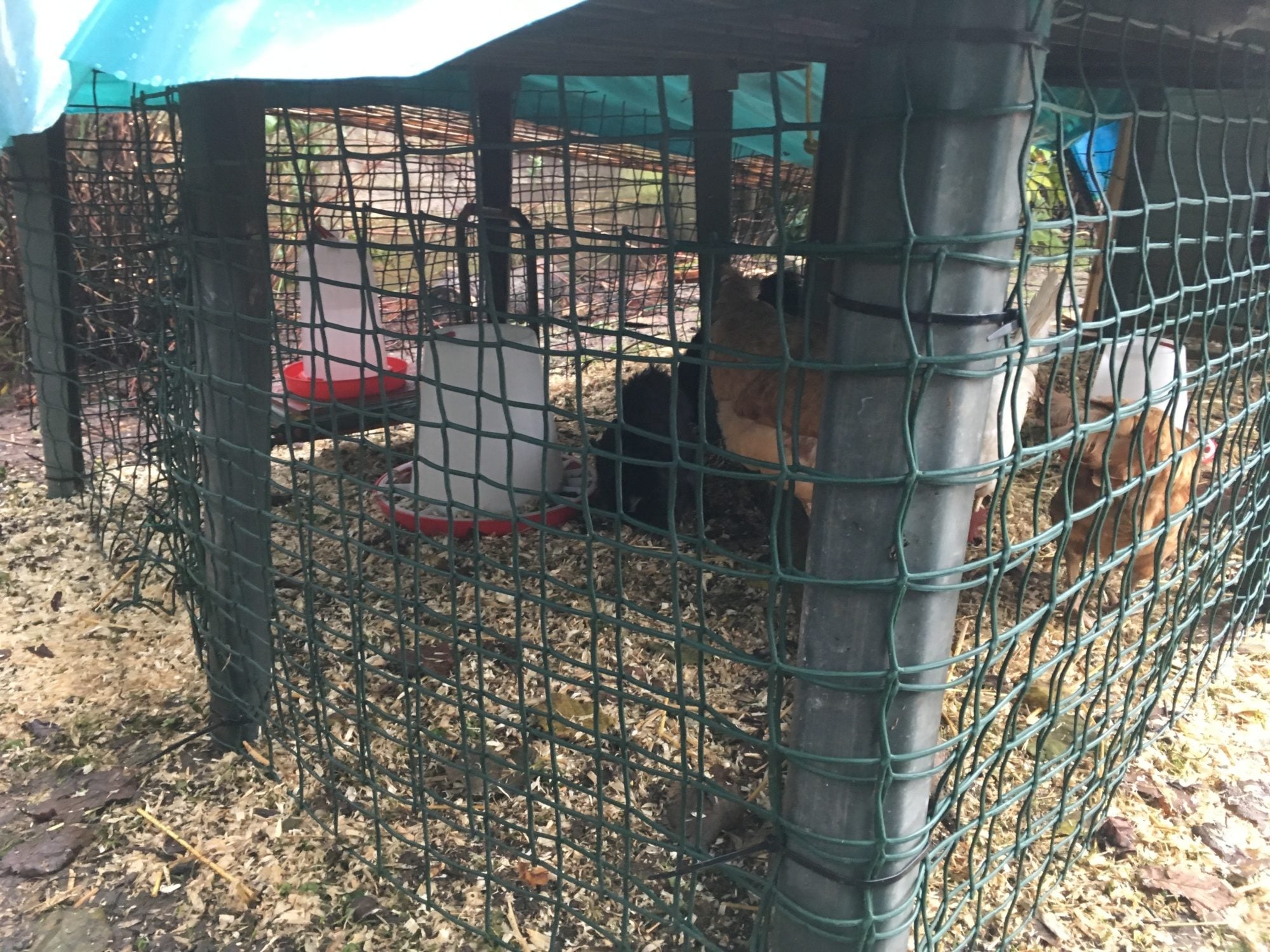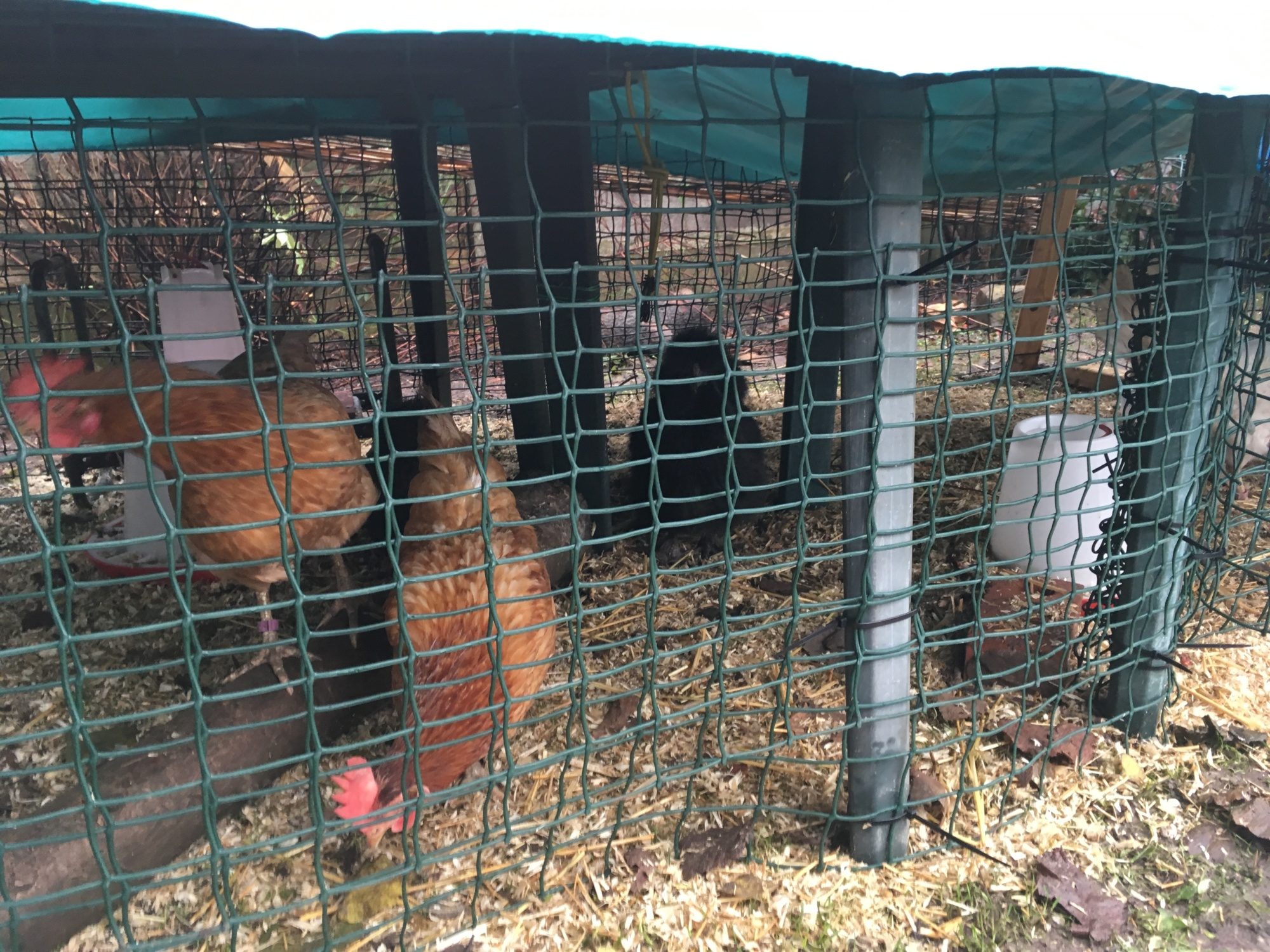 Managed to cobble a run together and used rolls of plastic garden netting to make them secure-using plant rings to secure at certain points so I can get in and clean remove/replace feed and water etc. Have put the run from the other coop at the front so they can use both back and front doors. They are using the washing up bowl/dust bath so am happy about that