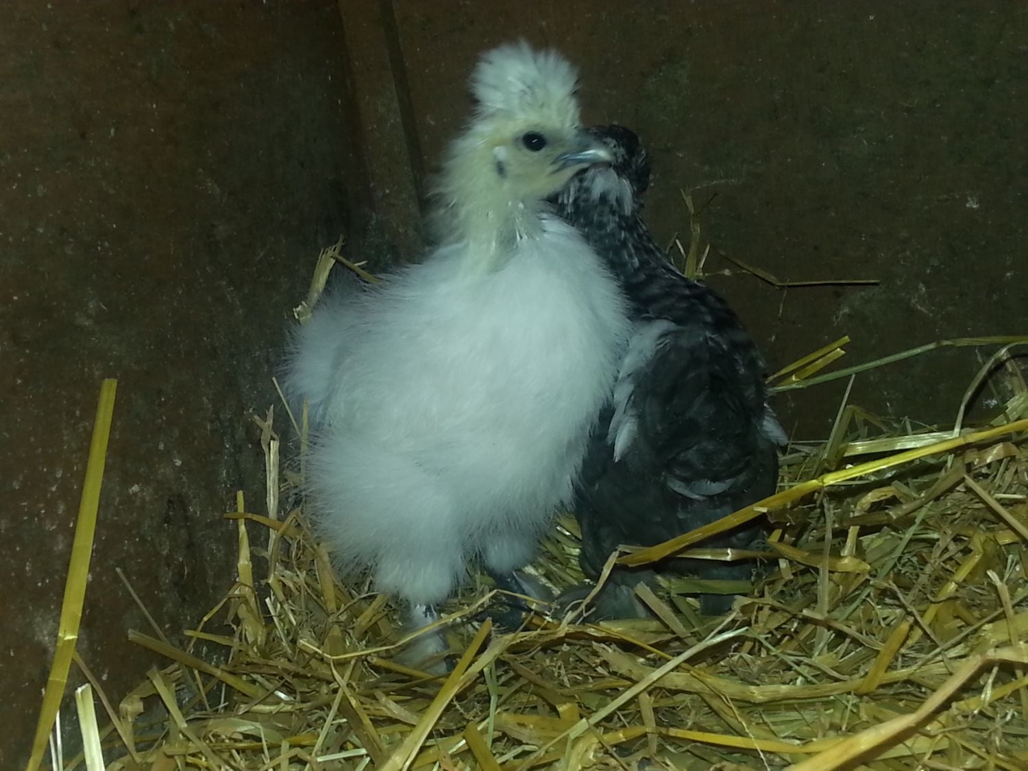 The dark chicks in the photo are from a polish hen. I havent got into genetics but I find it interesting. The mum of these was a light speckled polish and the dad is a peking. The light chick is from the same dad but a white silkie, he/she doesnt seem to have the silkie feathers though.