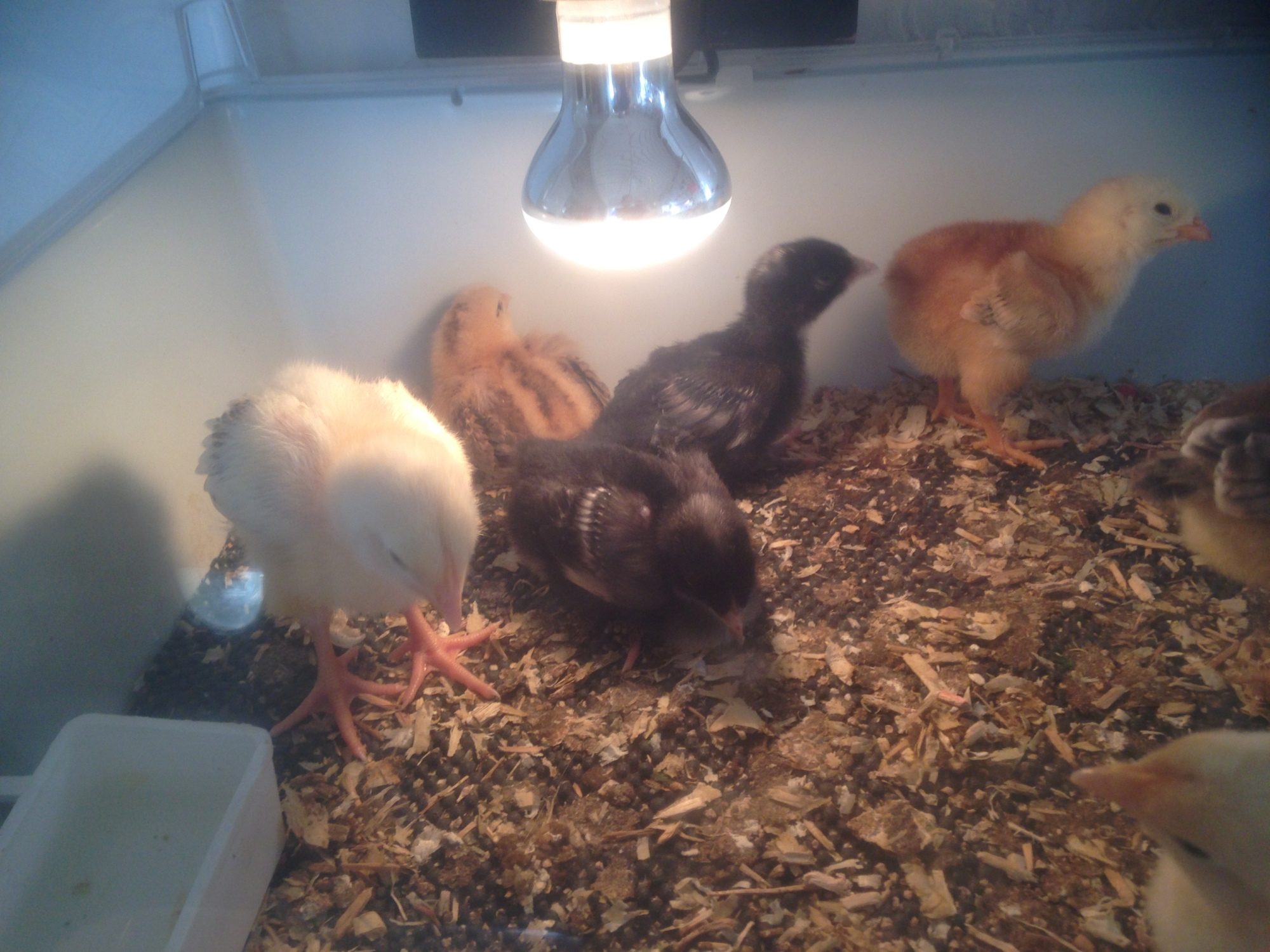 Yes a bit of a bummer with the three cockerels and I'm dreading culling them :( They just seem too cute and fluffy!! I've messaged a girl I know who took my mums cockerel to see if she wants them. She likes to rescue them and has a big batchelor pad on an allotment so we will see what she says. The pekin seem to be black mottled from what I can see, they are a little wet yet but from what I have googled they seem black mottled.