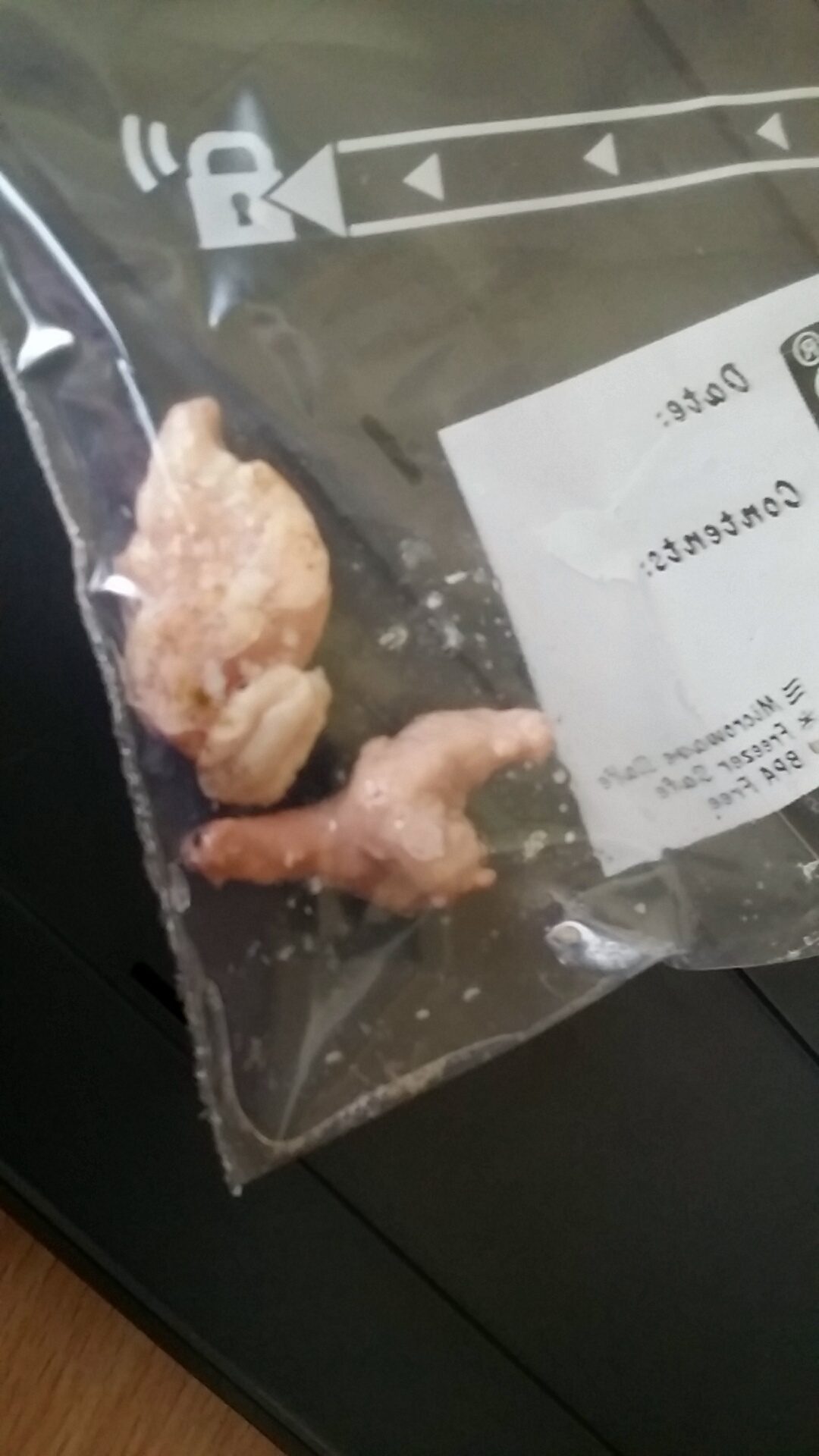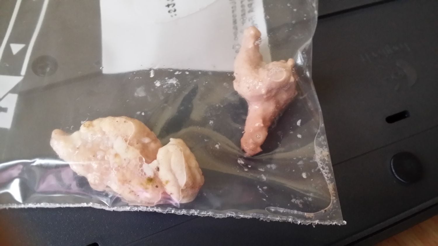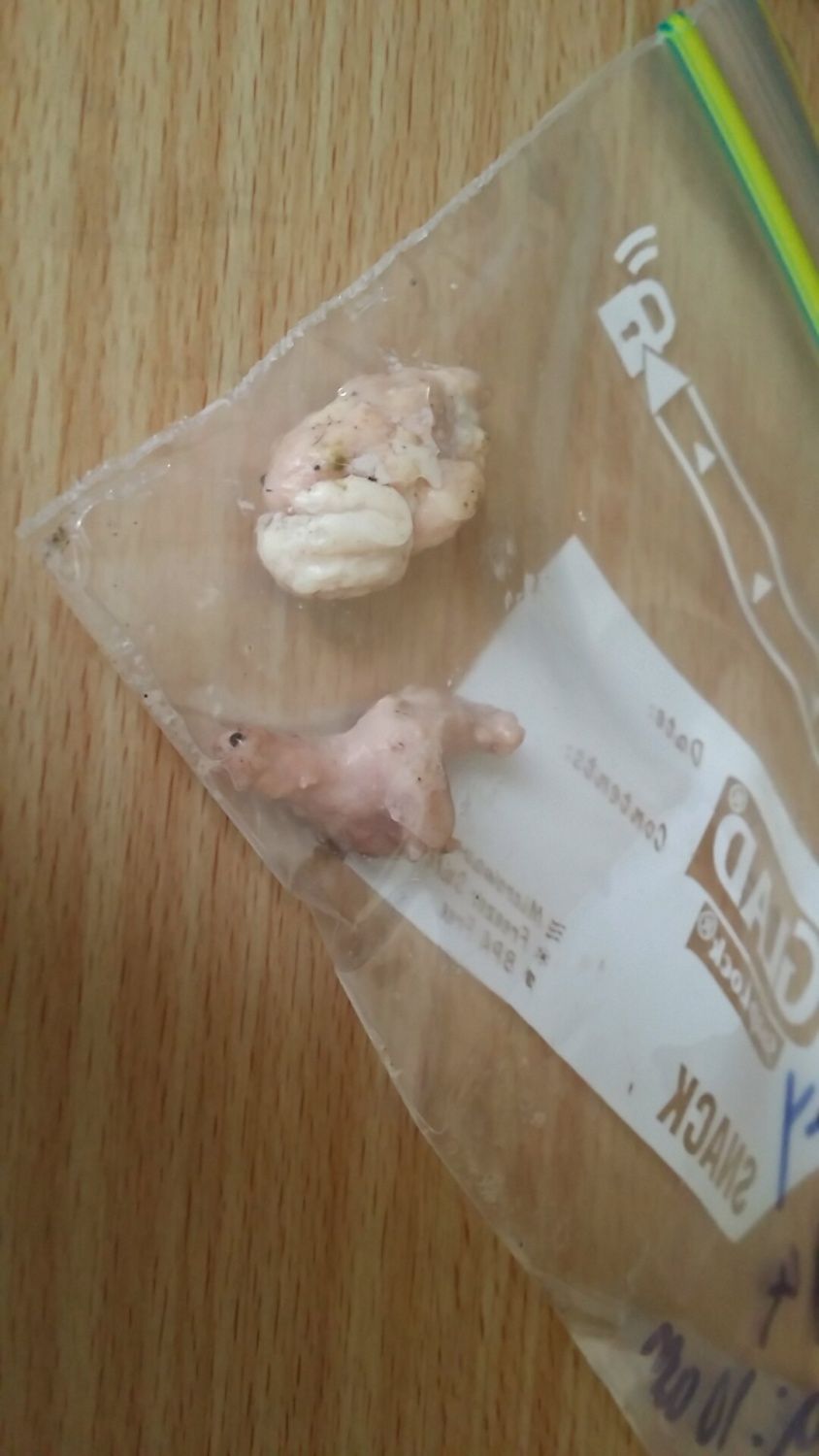My chicken walked into the coop about to lay an egg, then when she left, my mother spotted this unusual thing in her spot on the hay where she was sitting. We washed it then bagged it in case it was infected. If feels quite hard but not like bone, it feels more like a slightly harder chicken meat. No kidding it looks and feels like chicken meat. Before she "layed" it she stood in the same spot on the grass for almost 30 minutes doing nothing. She was moving very slowly and just really procrastinated. I'm not sure what this is cause I've never seen something like this before. Ohh yeah, and she didn't end up laying an egg. None of my chickens are laying at the moment, its winter over where I live.
