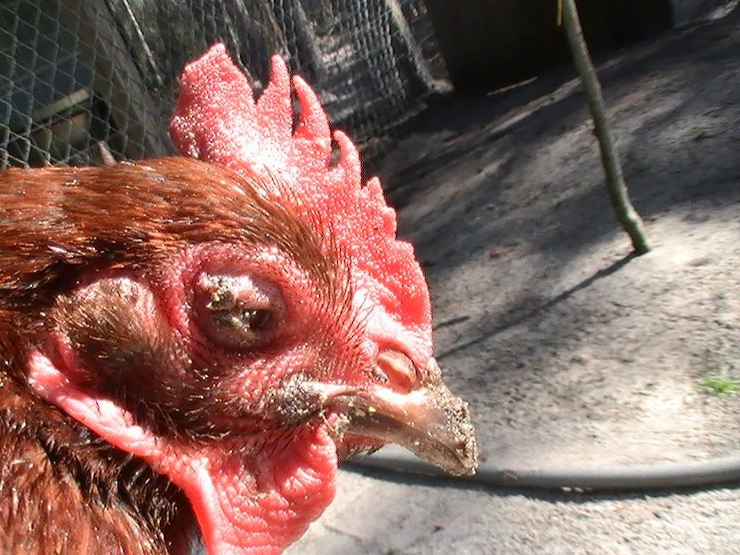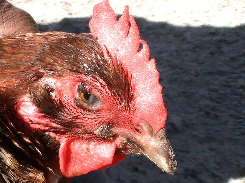 It is a relief to see much improvement in Lizzie and Missy, my set of partridge rocks. They both seem to have been injured by coop mates. I was able to take Lizzie out for a bit of sun and green nibbling today. She is standing and walking with a quick adjustment to what seems to be soreness with some steps. But thank God she is up and moving better. She will remain in the chick hospital until she is fully recovered. I was concerned about Missy yesterday when I found her with a swollen eye and ear on one side of her face. I checked her today to find that she had a lot less swelling and could see more of that beautiful brown eye. I washed it with sterile eyewash a few times and it seems she had either been hit in the eye or had some debris in there. Once she gave her head a good shake to get the wash of her face, she opened the eye and went looking for greens and grass. This what they both look like today. Thanks for the input, I have bookmarked a few more sites for reference thanks to you. What are the green spots in her wound?