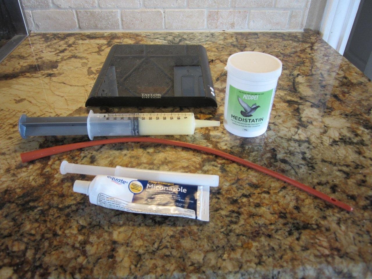 • Give her a slightly less than full scoop of Nystatin mixed in water twice a day via a feeding tube.