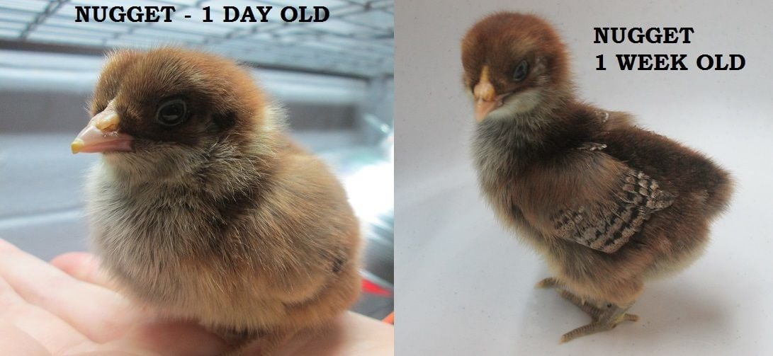 Nugget got her name as a warning because at first she acted all sweetiepoo on me but when we got home, she became a bit of a brat. She still comes running up to me at the side of the brooder, but she isn't very sweet to the other babies lol. You can see Nugget's legs have darken up to a greenish color.