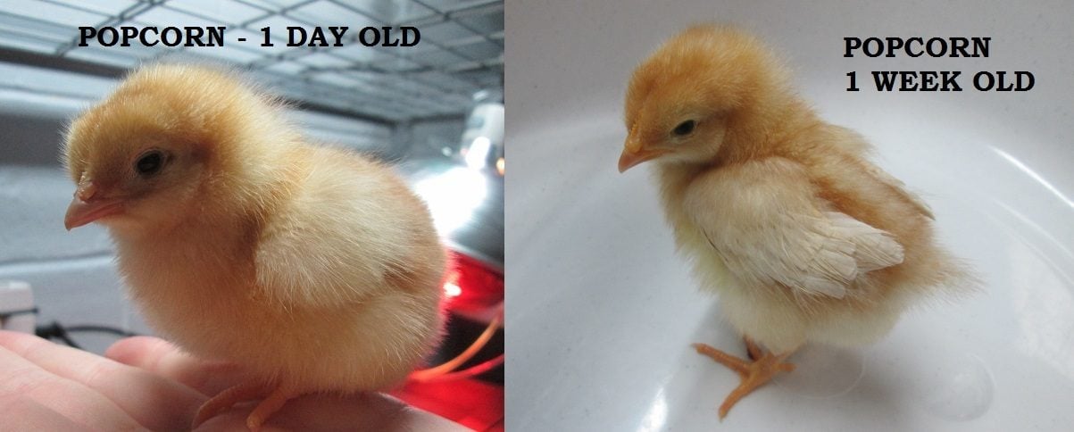 Popcorn is my little darlin'. She is so sweet and likes to sit quietly in my hand and look around quite contentedly. Since she is a Golden Comet, she will be white and gold and even now resembles buttered popcorn! You can also see a bit of tail feather coming in for her too.