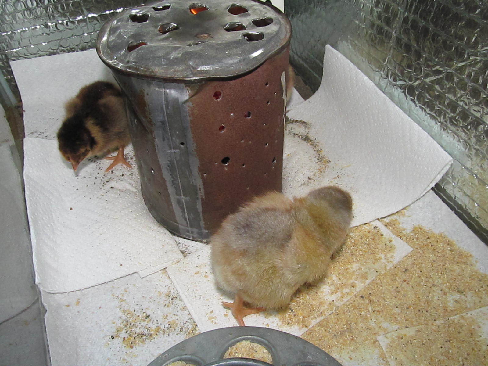 . This is a great alternative to using electricity if your power is out or if like me you have very limited electricity because you live off the grid. I have found that it is easy to adjust the temp by adding a lamp or adding more covers on the top or by opening up the top for more fresh air. there is little to no smell and the chicks seem very content snuggling up to their "mother" tin can. I need someone to crochet me a wool chicken cover for the can lol..paper towels are down for the new chicks until they are eating well.