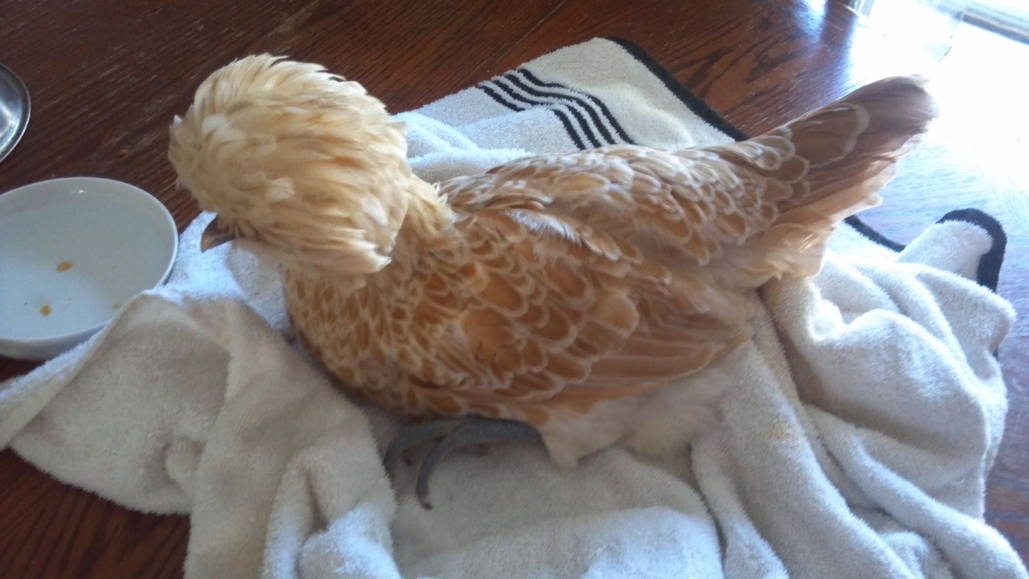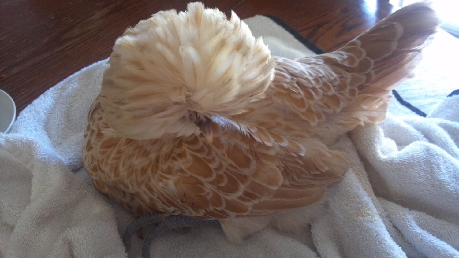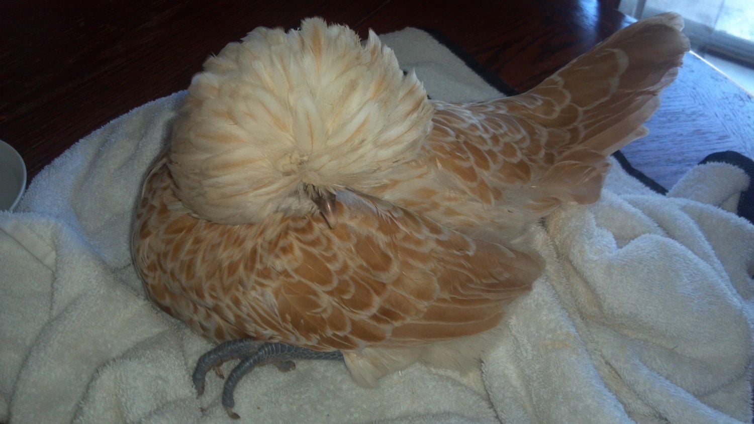So when my brother-in-law wakes up, I'm having him put her down. And I'm definitely hurting because she was one of my favorites. She and her sister would always run up to me when they heard me, and stand on my feet. As a buff polish, they are semi-blind because of their crests, but she knew my voice and knew I would protect her and handle her gently. And the sad thing is, I started out with 7 buff polish pullets, but lost all except these last two. And once I put this one down, I'll only have the last one left.