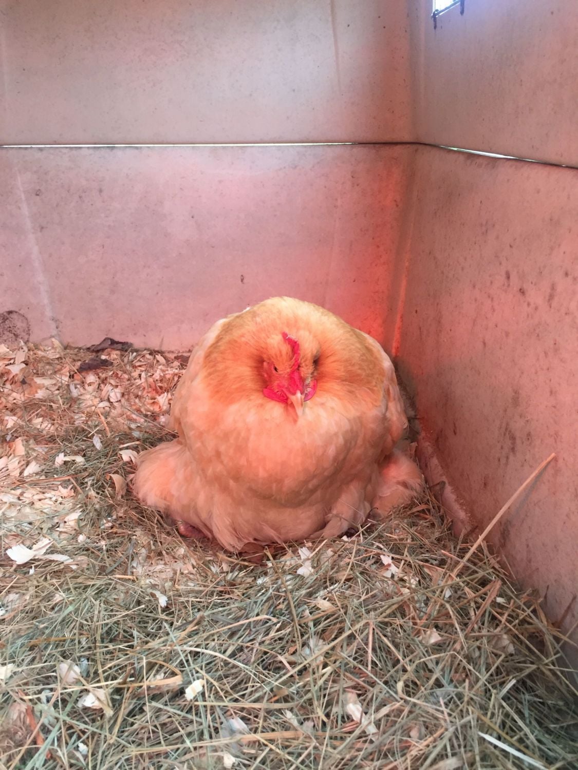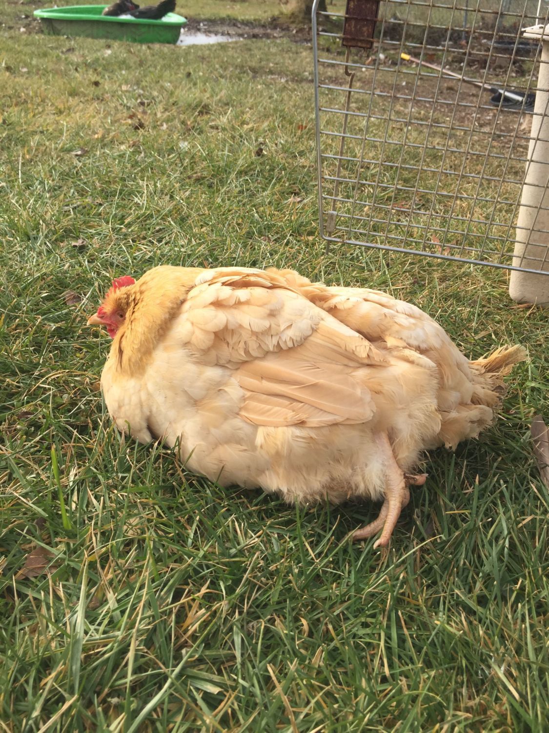 In this picture she is laying down she hasn't been laying down much we think it might be because it hurts to lay, in this pic she lost her balance and I was monitoring her while she lay there for a bit in the rare winter sun's warm rays... She is currently separated in her own area (closed dog crate) with a heat lamp shining in the front part.... Please help, any insight on what could be wrong is greatly appreciated.