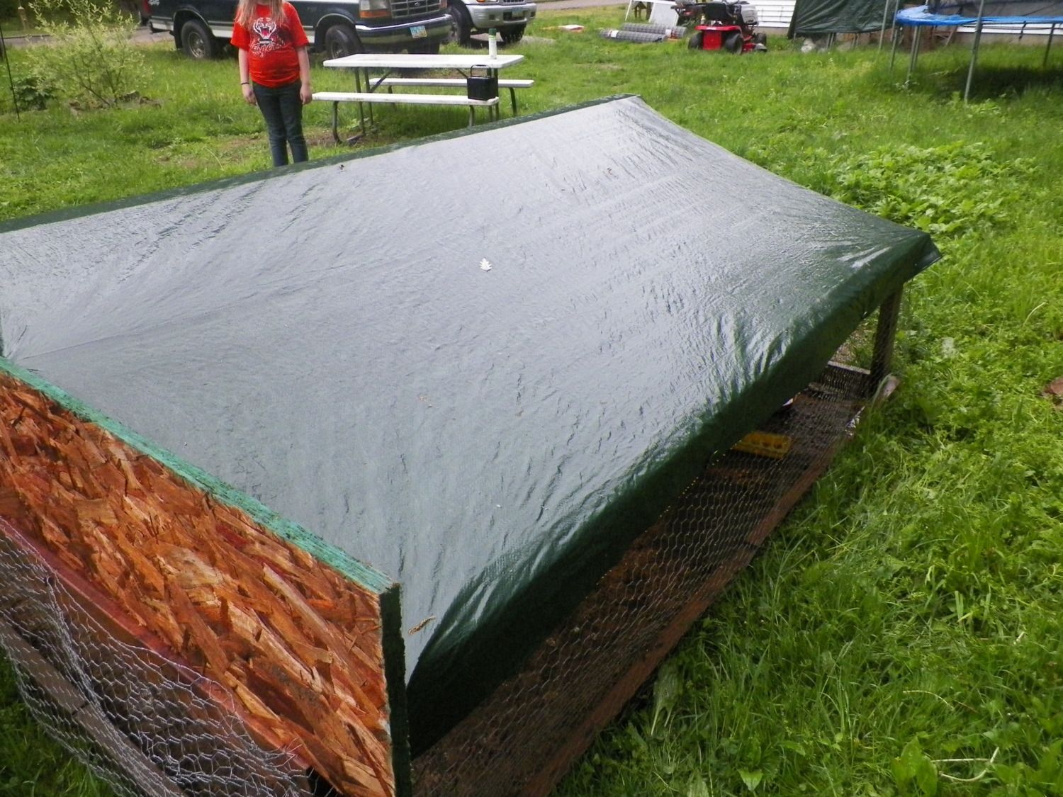 The corregated PVC roofing is very strong and sheds water and snow very well. We used drywall screws to attach it to the roof, which is constructed of 2x4s and plywood. We bought the sheets at Menards, a local home improvement store. They are overlapped by several inches and the slope drains off the back. It comes in several colors, but we chose white to keep it cooler in the summer.