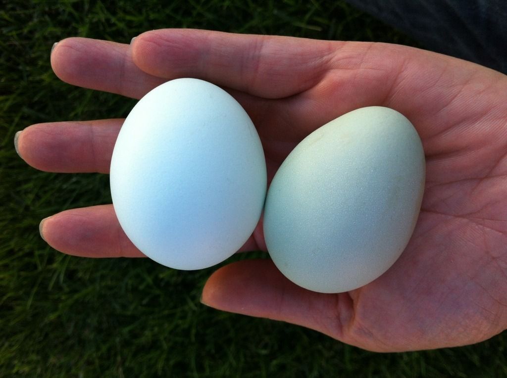 Here it is next to my cream legbar egg of the day (legbar on the left, pullet egg on right). I swear they're more blue in real life than this photo shows.