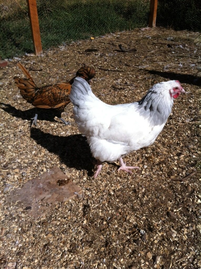 Whittni, here's my coronation sussex pullet (with Thing 1 in the background). I don't know why her feathers are fluffed funny. Guess it was just the way she was moving or the wind or something.