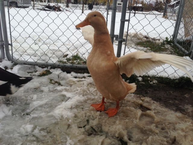 Well, last night/this morning we got about 4" of snow here in Hyrum. All my chickens were hatched between March-May of this year, so had never seen snow. In the morning when I open their hen door, the bantam cochins and Hedwig (Ameraucana) come bursting out of their door at the same time. This morning, they burst, and quickly came back down onto the ramp because they saw all that funny looking white stuff covering everything. Hedwig hadn't made it out the door, but the cochins had, and they quickly went back inside. Bullet, SLW, was next. She slowly walked down the ramp, and stood there cocking her head to get a better look at the snow. I was laughing my head off at her! After a few minutes, all the girls were standing on the ramp, wanting to get down, but too weary of the snow to do so. It was hilarious! they went back into the coop for a while, but when I got home from work, they were all outside, underneath the coop where there wasn't any snow. :)