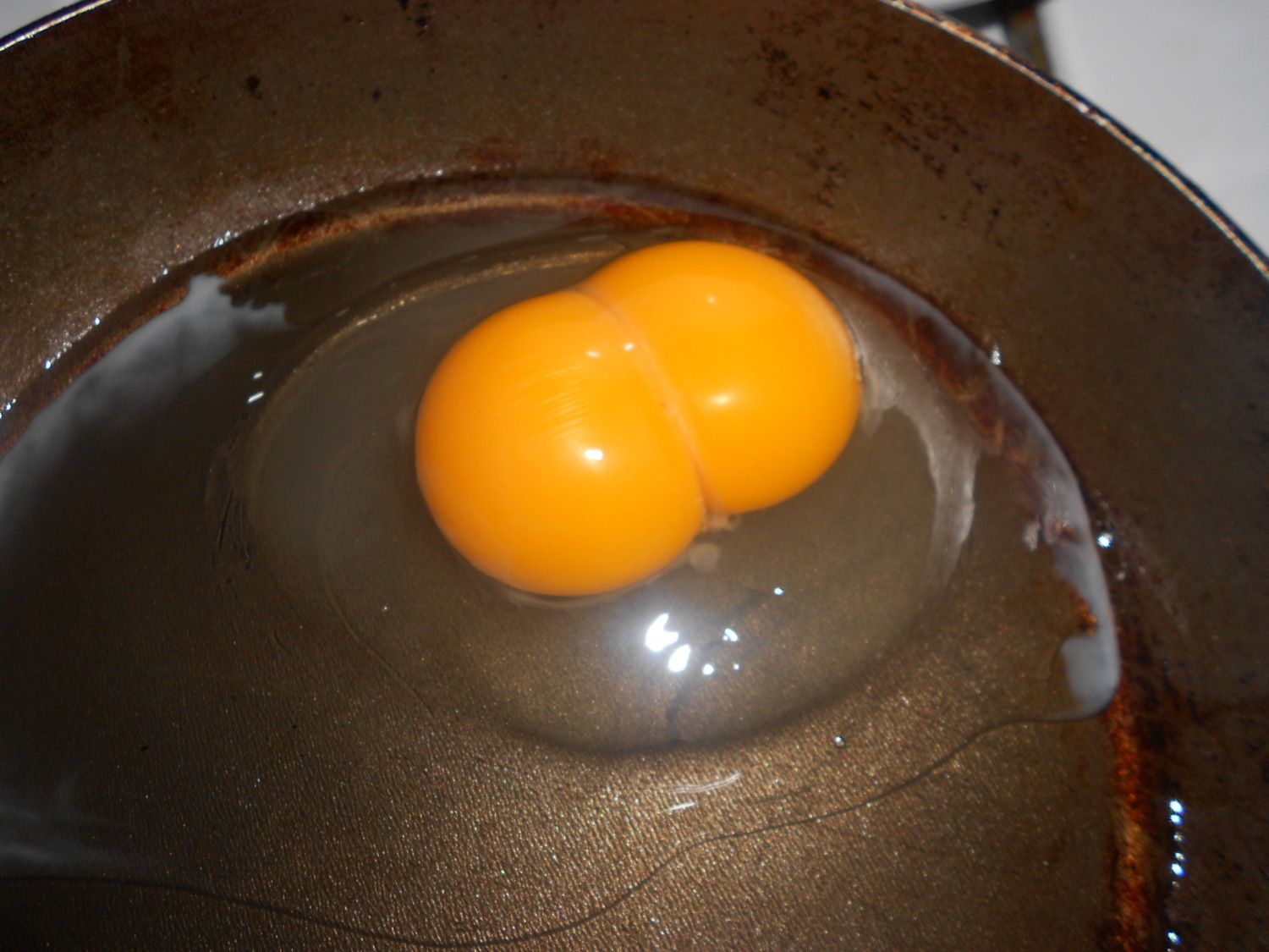 Its 8:50 pm and its 40 degrees outside, and some of my chickens are walking around outside like its a heat wave. Crazy chickens! Having an egg sandwich for dinner and the big egg was a double. Notice how the yolks are joined. I wonder if i could have got it to hatch if they would have been joined twins?