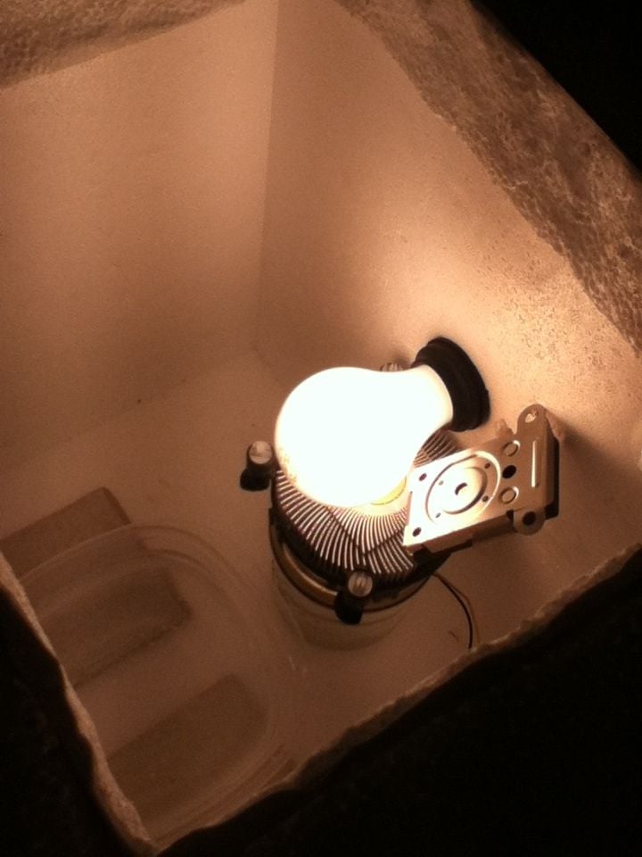 Hey all, so I made my incubator (using lots of info from BYC). I'm not quite finished, but here is the foundation. I currently have 3 mason jars with water (heatsinks), a tupperware of water on some ceramic tiles (for humidity), a water heater thermometer, and a PC fan (sitting on a mason jar) to blow up at the light and thermometer. I haven't bought a thermometer/hygrometer to measure the exact temperature and humidity, but the food thermometer I have in there says the temperature is fluctuating between 96 and 104 degrees. What could I do to regulate the temperature better? What should the humidity be here in Northern Utah?