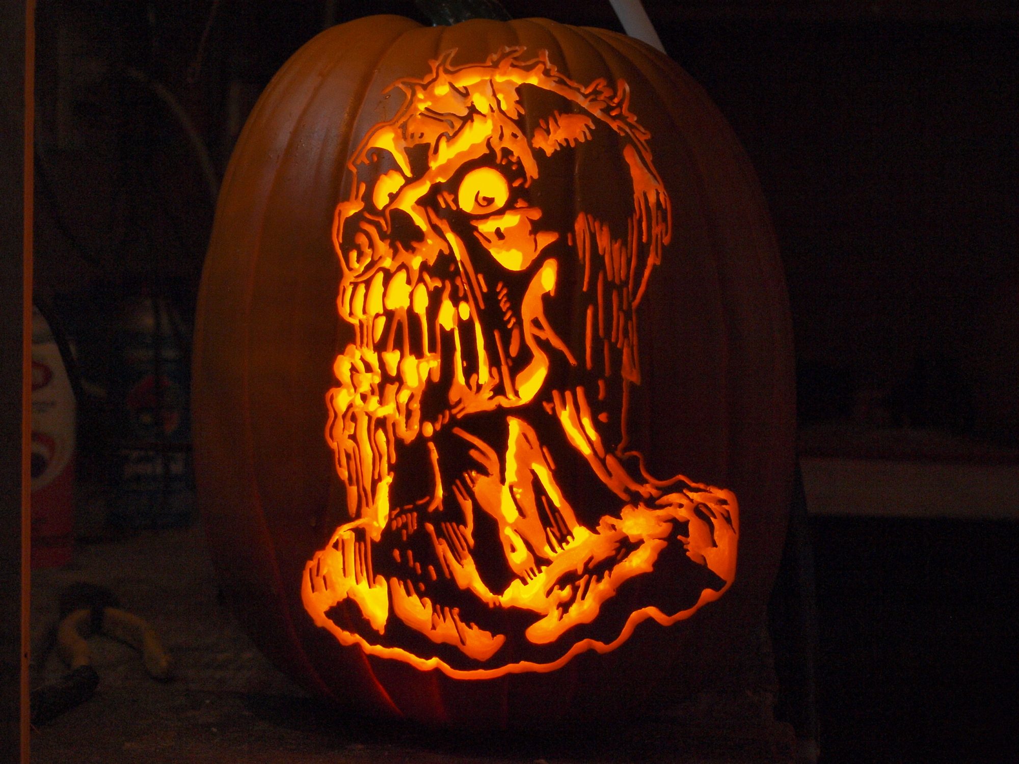 Quote: That is awesome! I use to try stuff like this but it kind of turned out dumb, so i just carve faces now (usually around 20 or so). I usually have an extra couple dozen after carving so i just pile them up in the garden and let the chickens pig out.