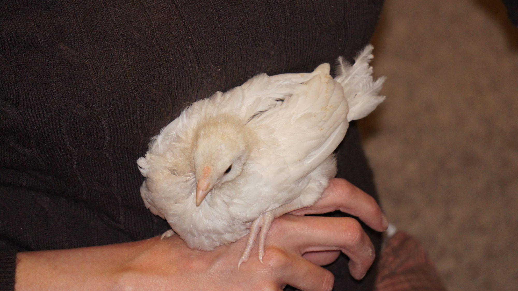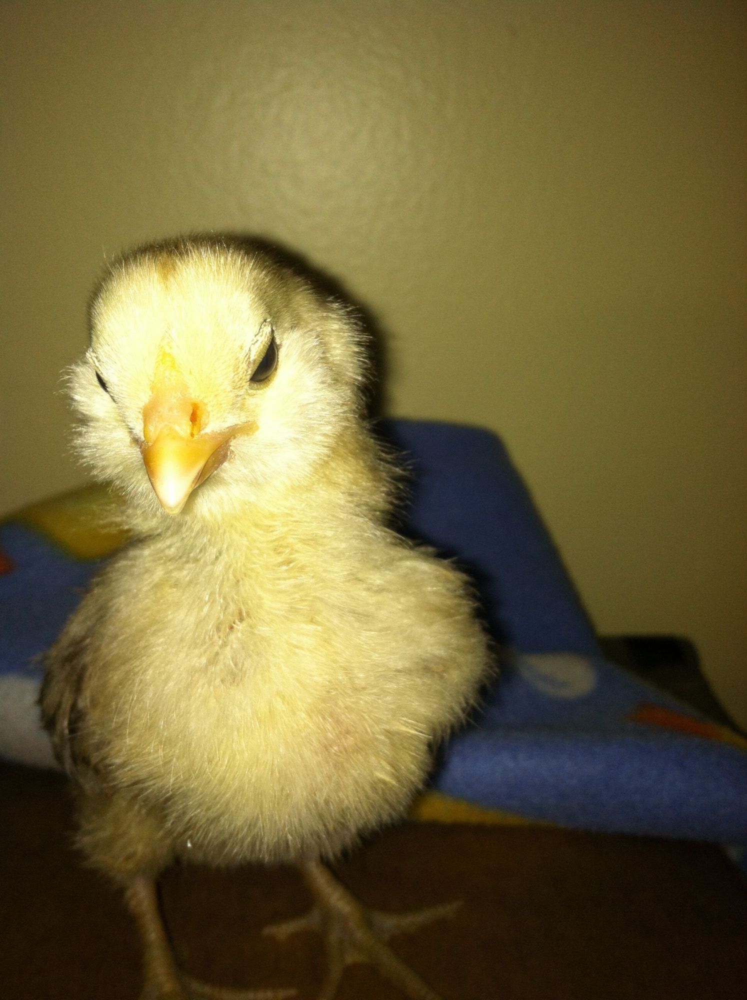 This is one of the frizzled EE chicks from Sundance's eggs. I believe this one is a girl, and definitely frizzled! She reminds me of a swan. No beard and muffs on her.
