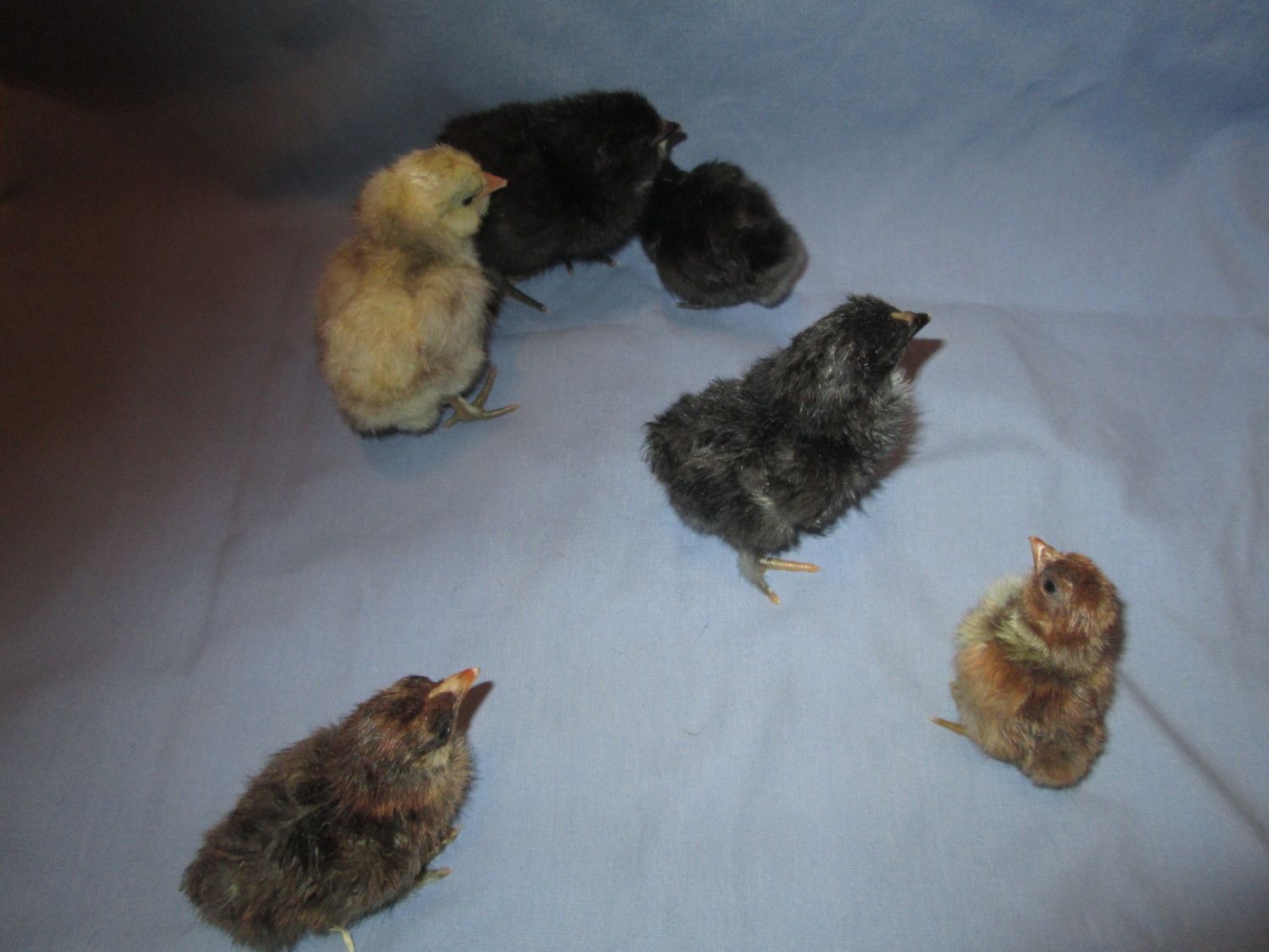 Group shot. The light one has a smoky coloring..all of the mix babies have feathered feet.