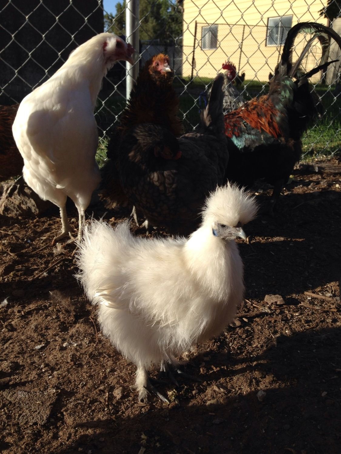 That does look female! yay! I see this one is non bearded--I got another one in that batch that was non bearded, and it has wattlesHoly moly, where are you guys?! I thought I would be pages and pages behind because of my absence. Lisa, my silkie ended up being white! I'm leaning towards it being a girl- there's no wattles at all at this point. Here's some pictures. What do you think?(Sundance, in the background is the auracana mix and frizzle that your broody frizzle gestated. Also back there is Houdini, the FBCM you found in your yard) Red, good luck to your boyfriend with court.