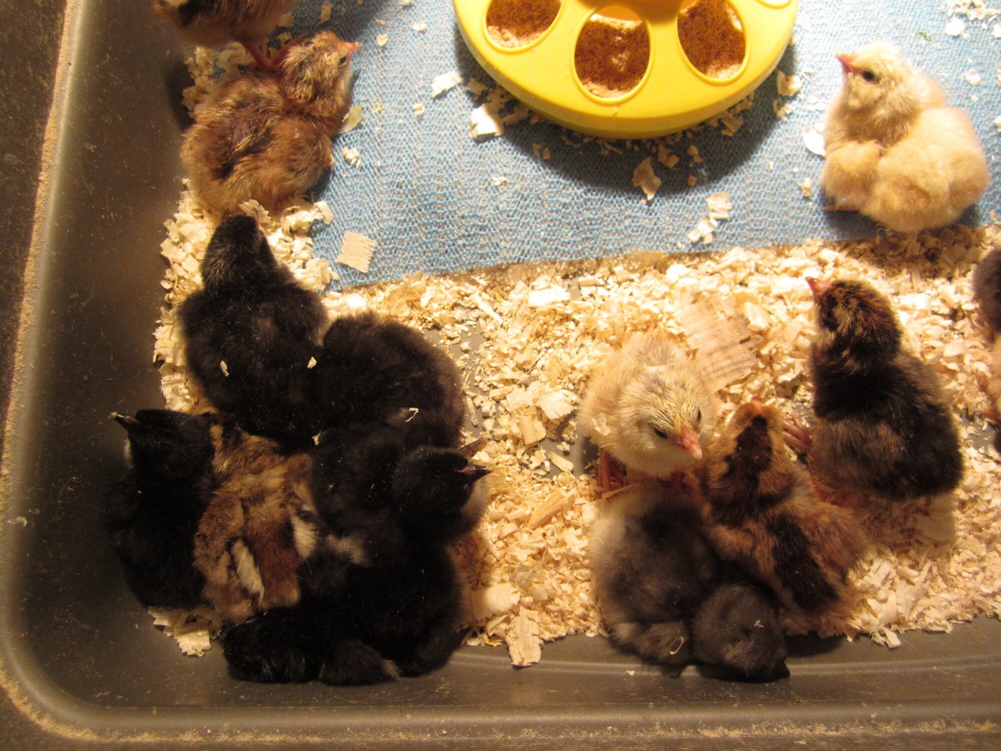 And here are the chicks. YIKES, they are so cute. Anyone know if all these yellow, and yellow with chipmunk blue are Wheaten Ameraucana's. They are all from blue eggs. I'll have to get some cute photos of them tomorrow.